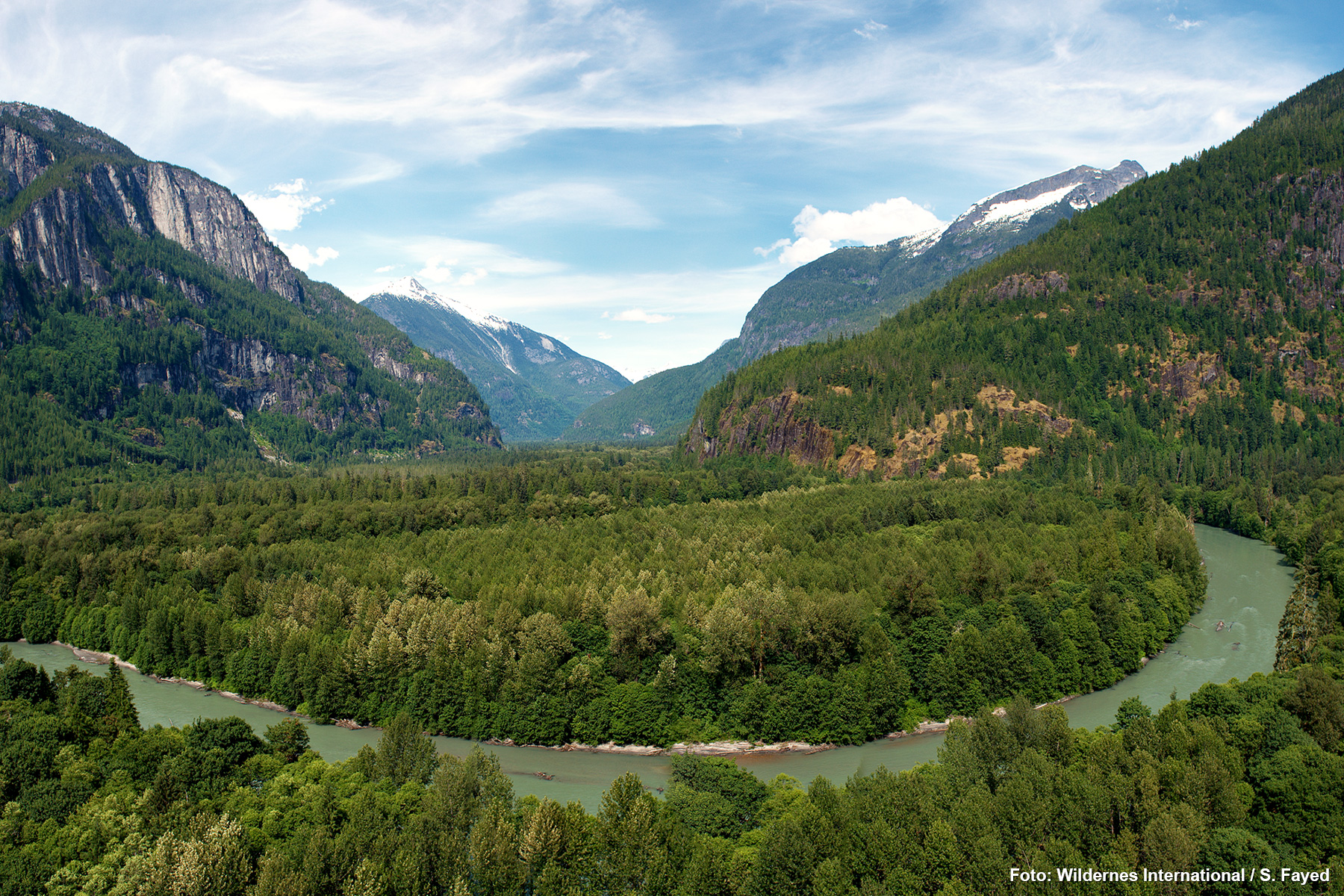 Die deutsche Stiftung Wilderness International kauft besonders wertvolle und akut gefährdete Wildnisgebiete in British Columbia, die so per Grundbucheintrag dauerhaft geschützt werden. In jedem Quadratmeter sind hier im Schnitt 105kg CO₂ gebunden. Zudem sind diese Wälder Lebensraum für Grizzlybären, Wapitis, Adler sowie unzählige weitere Arten.