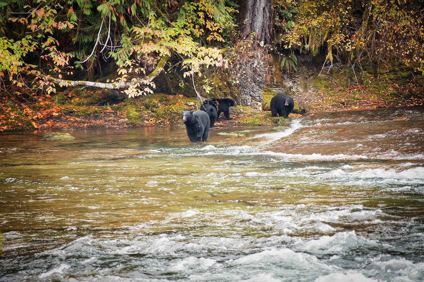 Wir laufen nochmal zu den Wasserfällen für eine kurze Wanderung und treffen auf Holly und ihre Familie. Sie kommen immer zu Thanksgiving aus dem nahen Port Alberni zu den Wasserfällen. Unser Junge hatte ein paar Fotos von ihr und ihrer Familie gemacht und wir tauschen Mailadressen, um die Fotos zuzusenden. Das gehört auch immer zu unserem Urlaub, Land und Leute kennenlernen und die Kanadier sind sehr offen und gastfreundlich. Zurück am Camper rüsten wir zum Aufbruch. Unser nächstes Ziel ist Campbell River. Wir rollen langsam los, werfen einen letzten Blick auf den Fluss… Sind da Bären? Yes, die Schwarzbärin mit ihren Jungen ist wieder da. Wir freuen uns, bleiben noch ein halbes Stündchen und beobachten die 4 Bären. Wir sind sprachlos… Einfach ein wunderschönes Erlebnis!