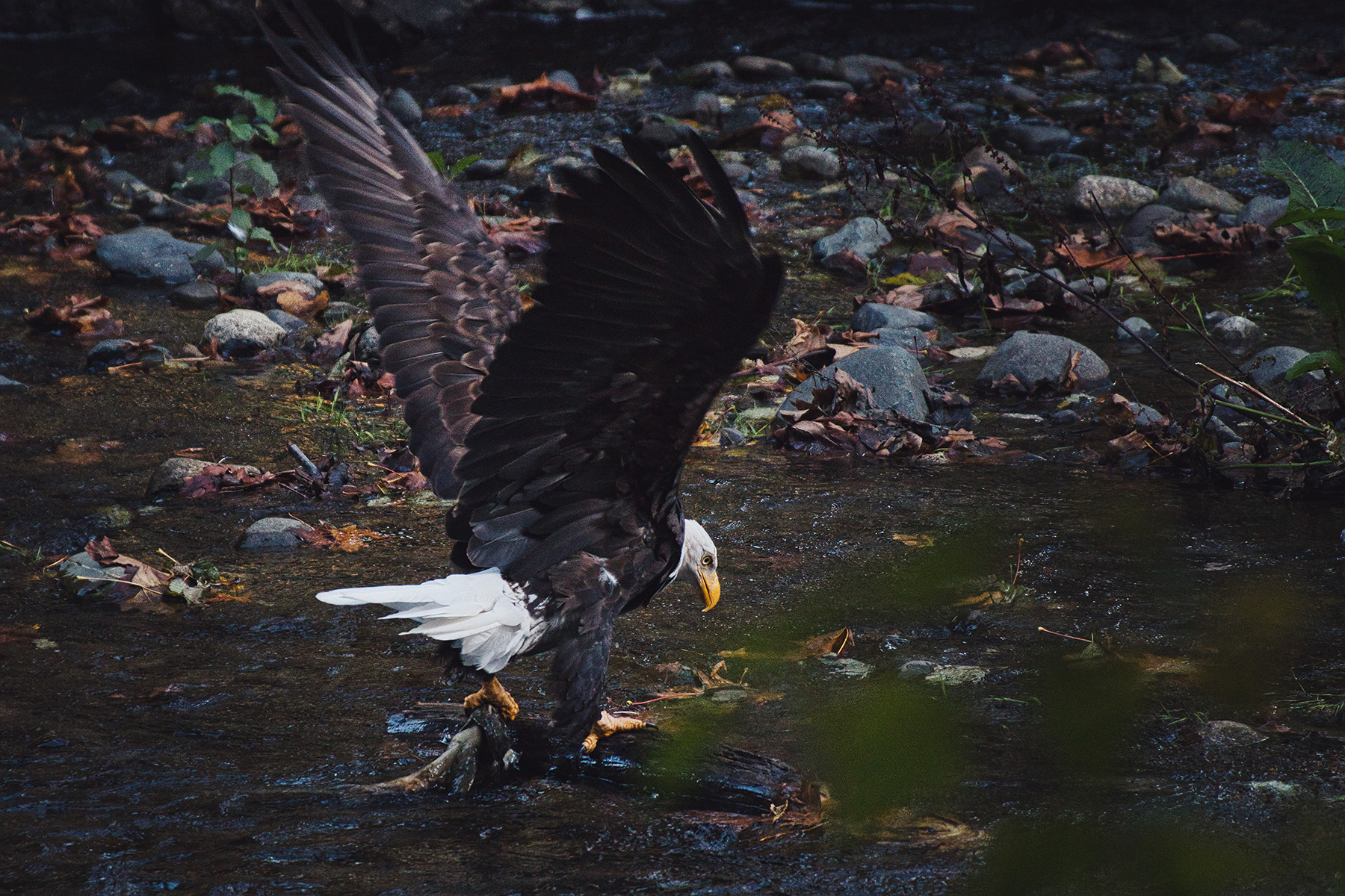 Hier sind auch riesige Lachsschwärme zu sehen und viele Angler. Wir angeln heute mal nicht, als wir ein Weilchen warten, landet ein Weisskopfseeadler im Fluss, nur wenige Meter vom Ufer entfernt, um sich einen Lachs zu schnappen. Ein zweiter Adler sitzt oben im Baum und später, als wir zurück zu unserer Site laufen, schlendert in der Dämmerung ein Schwarzbär am Flussufer entlang. All diese Erinnerung werden wir immer in uns behalten!