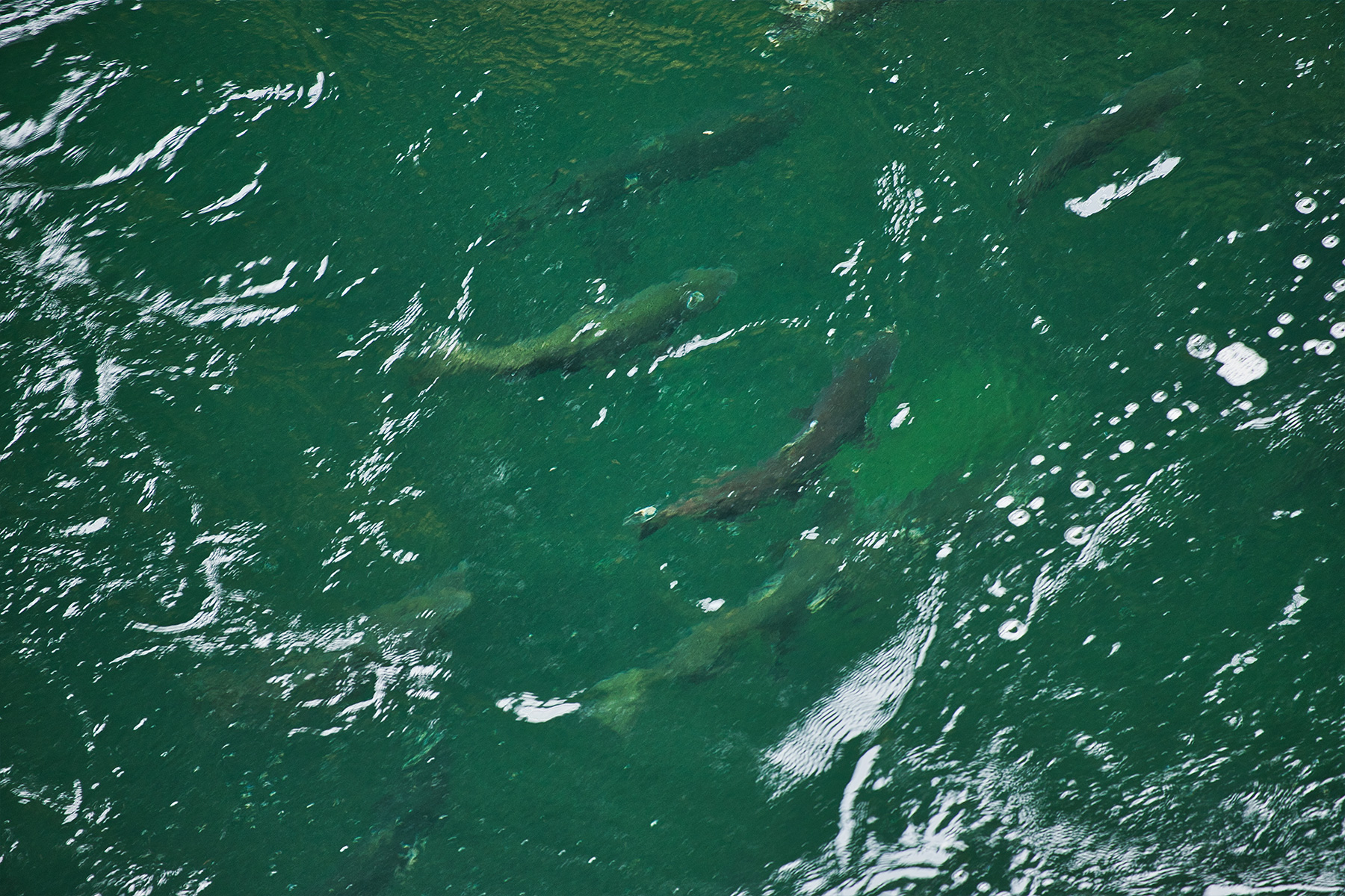 Auf dem Rückweg bleiben wir eine Nacht auf dem Elk River Campground nahe Campbell River. Als wir am frühen Abend ankommen ist der Platz bereits gut belegt. Der Camphost fragt uns nach unseren Plänen. Wissen wir noch nicht. Er rät uns, unsere Campingstühle zu nehmen und ein Stück runter an den Elk River zu laufen bis zur Brücke, uns hinzusetzen und einfach abzuwarten… Ok, machen wir gern!