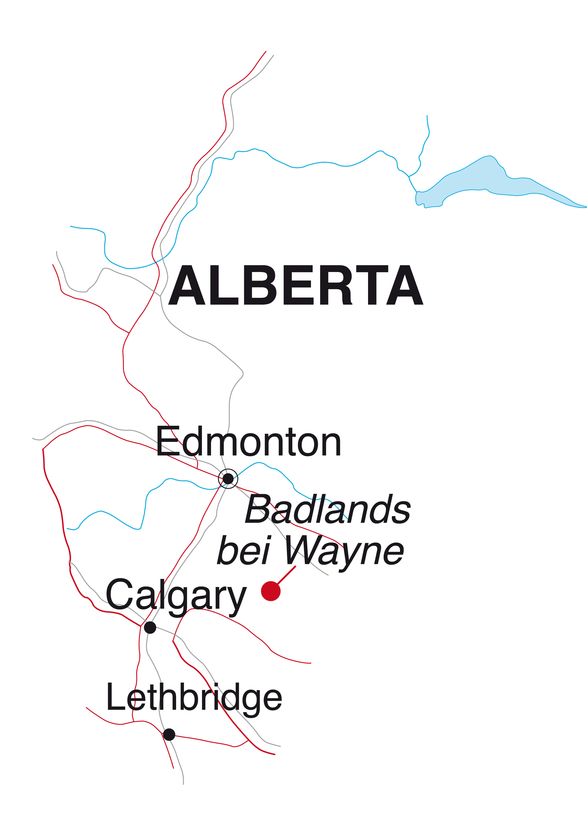 Die Badlands, das ist gewellte Prärie bis hinter den Horizont, sparsame Landschaft, dünn besiedelt. Mit hineingestanzten Canyons. Und meist trockenen Flussbetten, "Coulées" genannt. Der Autofahrer erlebt sie wie tiefe Löcher in einer Welt, die flach wie eine Scheibe ist und, weil keine Erhebung den Blick auf die Erdkrümmung verstellt, am Horizont dann doch noch unmerklich rund wird. Wer hier lebt, ist ein Insulaner in einem Ozean aus Gras. Und trägt das Abzeichen seiner Zunft auf dem Kopf: Baseballkappen die Farmer, Trucker und Angestellten der Bewässerungsfirmen, Stetsons die Rancher und Cowboys. Man trifft sich auf Rodeos, Viehauktionen und Bauernmärkten. Und überlegt im Saloon, wo die Gäste ihre Steaks selbst grillen, wie man die jungen Leute dazu bringt, daheim zu bleiben anstatt nach Calgary oder gar Vancouver zu ziehen. Inzwischen setzt man auch auf den Tourismus. Das touristische Manko der Badlands - keine Berge, keine Grizzlies, keine 5-Sterne-Resorts - wird kurzerhand zu ihrer Stärke erklärt: Wollt Ihr ein Stück ungeschliffenes Kanada erleben? Frei atmen und Wildnisgebiete ganz für Euch ganz allein haben? Die Badlands. Für Stadtneurotiker!