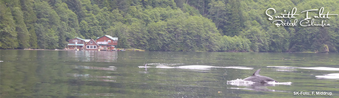 Nach dem Mittagessen geht es gemeinsam mit allen Gästen und unseren Guides zur täglichen Mystery Activity. Geplant war ursprünglich eine Bootsfahrt zu einem versteckten Wasserfall. Aber Pläne können sich ändern! Auf der anderen Seite der Bucht ist eine Gruppe Delfine zu sehen. In wenigen Sekunden sitzen wir im Boot und sind bereit für die Abfahrt! Das ist so aufregend! Guide Taylor sagt, dass ein Besuch der Pacific white-sided dolphins etwas ganz Besonderes ist. Sie schwimmen nur ab und zu den gesamten Weg aus dem offenen Ozean bis ans Ende des Smith Inlet. Wir nähern uns den Tieren. Es ist spektakulär und unwirklich zugleich! Die Delfine sind überall! Vor uns, hinter uns, neben uns und unter uns. Ich weiß gar nicht wo ich hinschauen soll! Mindestens 30 Delfine spielen in den Wellen der Boote. Egal ob jung oder alt, aus Deutschland, Schweden, Amerika oder Australien, wir alle werden zu kleinen Kindern und feiern diesen wunderbaren Moment! Inklusive unserer Guides! Meine Emotionen spielen ganz verrückt. Ich bin überglücklich und gleichzeitig auch komplett überwältigt von dem was ich gerade erlebe. Tränen schießen in meine Augen, während sich mein Lächeln übers ganze Gesicht zieht.
