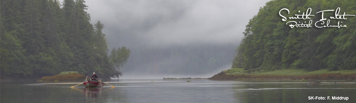 Guide Marlo holt mich mit einem freundlichen Anstupser zurück ins Hier uns Jetzt. Es ist Zeit sich fertig zu machen für eine nächste abenteuerreiche Bootstour. Ich hüpfe bei Marlo ins Boot und schließe mich den Gästen aus England an. Gaynor und Mark machen mit ihren beiden Söhnen Urlaub in Kanada und genießen die Vielfalt des Landes in vollen Zügen. Faszinierender Weise sieht die Region hier am Ende des Smith Inlet jeden Tag ein wenig anders aus. Heute ist durch die ausgeprägte Ebbe ein großer Teil des sonst vorrangig unter Wasser gelegenen Gebiets freigelegt. Muschelansammlungen an Felsen kommen zum Vorschein, Baumstämme schauen aus dem Wasser hervor und tiefgrüne Grasflächen zieren die Ufer. Der geringe Wasserstand ist allerdings für das Vorankommen im Boot eine Herausforderung. Marlo steigt mehrmals aus und zieht das Boot mit der gesamten Besatzung durchs Wasser. Voller Einsatz! Und das immer mit einem Lächeln im Gesicht!