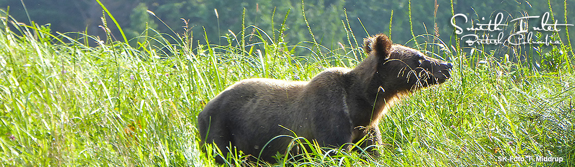 Marlo begleitet uns heute Abend als Guide und erklärt mir, dass in dieser Region Salzwasser aus dem Pazifik und Süßwasser aus dem hier mündenden Nekite River aufeinander treffen und sich vermischen. Diese Besonderheit bietet einen hervorragenden Lebensraum für verschiedenste Tierarten. In den Sommermonaten stehen den Grizzlies viele verschiedene Nahrungsquellen zur Verfügung. Unter anderem ernähren sie sich vom saftig grünen Riedgras. Marlo ordnet gerade die hörbaren Vogelstimmen ihren Erzeugern zu, da verfällt sie mit einem Mal ins Schweigen. Sie wirft einen konzentrierten Blick durch ihr Fernglas und teilt uns wenige Sekunden später mit, dass sie einen Bären sieht. Ich brauche einen kurzen Moment, um zu begreifen was hier vor sich geht. Wenig später entdecke auch ich die Grizzlyohren versteckt im hohen Gras. Direkt auf meiner ersten Tour nur wenige Stunden nachdem ich auf der Lodge angekommen bin, sehe ich meinen ersten Grizzly. Fantastisch! Ich versuche ein Bild von dem Bären zu machen, da entdecke ich auf einmal ein zweites Paar Ohren. Ich glaube es nicht, das wird ja immer besser! Beim Anblick der beiden Grizzlies fällt mir ein, dass Rainer und Markus von einem Bärenpaar gesprochen haben. Vielleicht sind es ja die beiden Geschwister Fex und Joy. Marlo kann es mir nicht zu hundert Prozent bestätigen, aber es sieht ganz danach aus. Ein mehr als perfekter Start in meine Zeit hier auf der Great Bear Lodge!