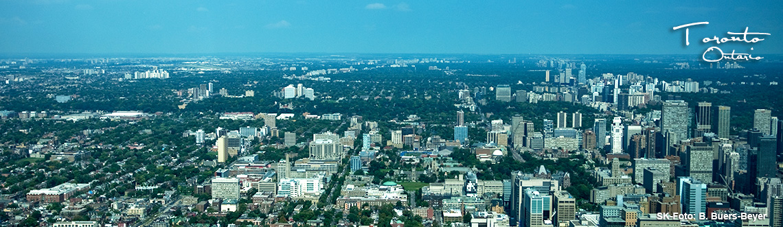 Mit der Air Canada hebe ich in Calgary ab und starte die Reise in Richtung Toronto. Die größte Stadt Kanadas liegt in der Provinz Ontario und ist der östlichste Punkt, den ich bisher angesteuert habe. In den letzten Monaten bin ich ganz schön herumgekommen und habe dabei erlebt, wie vielseitig Kanada ist. Und außerdem auf welch gigantischer Fläche sich das Land erstreckt. Auf der Karte wirkt es gar nicht so weit von A nach B, in der Realität wird mir allerdings bewusst, dass diese Wahrnehmung sehr trügerisch ist. Gut dreieinhalb Stunden vergehen, bis ich am späten Abend den beleuchteten Großraum Torontos erreiche. Die Sicht aus dem Flugzeug ist überwältigend. Diese Stadt ist wirklich groß!