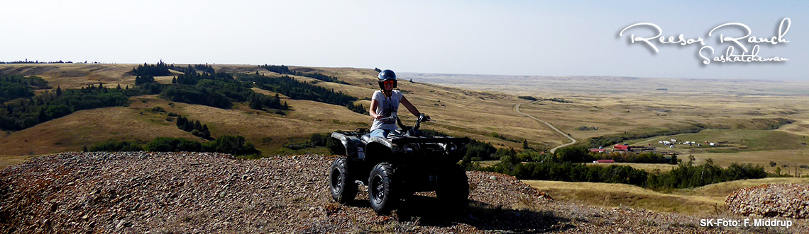 Nachdem wir in Zusammenarbeit den Transporter mit Wasserbehältern beladen haben, spaziere ich zur Ranch Hall und schnappe mir mein Frühstück. Mit vollen Energietanks hole ich Verbandsmaterial aus der Cabin und gehe zu einem der Pferde. Ruby hat sich vor mehreren Wochen auf der Weide verletzt und Deanna kümmert sich seither um sie. Das Bein sieht schon wieder richtig gut aus und ist im Vergleich zum ursprünglichen Befund nicht mehr wieder zu erkennen. Ich schmiere Salbe auf die Wunde und verbinde das Ganze anschließend in einem schönen Pink. Top Sache, Auftrag erledigt! Am Nachmittag steht für mich ein weiteres Highlight auf dem Programm. Wenn man eventuell mal vom Ross auf einen PS-stärkeren Untersatz wechseln möchte oder einfach Lust hat, die Cypress Hills Region auf eine ganz andere Art und Weise zu erkunden, hält die Historic Reesor Ranch eine fantastische Option parat. Neuerdings sind geführte ATV-Touren Teil des Angebots der Ranch. Für mich als Stadtkind gehört so ein Quad eher zu den ungewohnten Fortbewegungsmitteln. Umso mehr freue ich mich auf die aufregende Erkundungstour. Ich bekomme einen passenden Helm und Deanna erklärt mir ausführlich wie alles funktioniert. Tip top, dann kann es ja losgehen! Mal davon abgesehen, dass ich noch anfängliche Schwierigkeiten habe, gefühlvoll Gas zu geben, ist das Quad fahren gar nicht so tricky. Ich habe in jedem Fall eine Menge Spaß. Juhuu!