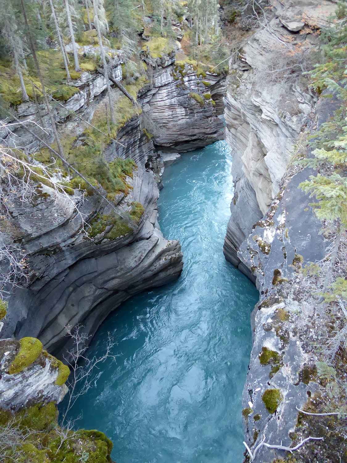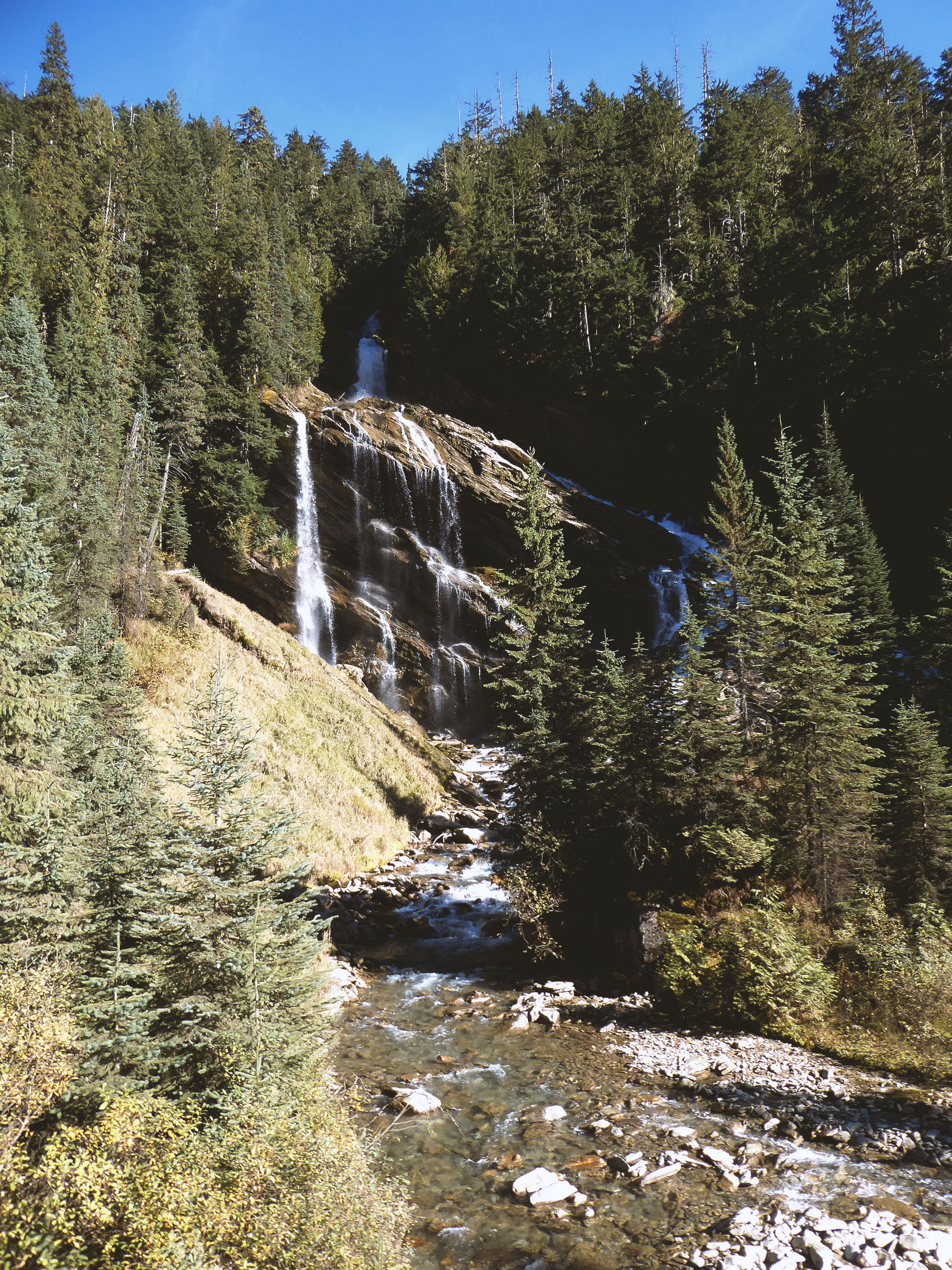 Ebenfalls organisiert von Rocky Mountaineer starten wir nach unserer zweitägigen Zugtour eine anschließende Busreise. Entlang des Icefields Parkway werden wir mit Stopps in Lake Louise und Banff nach insgesamt drei Tagen unsere letzte Station, Calgary erreichen. Bevor ich aber jetzt schon ans Ende des FAM-Trips denke, freue ich mich lieber auf die vielen Highlights, die uns in den Rocky Mountains erwarten. Der erste Stopp führt uns zu den Athabasca Falls. An dieser bestimmten Stelle des Athabasca River stürzen die Wassermassen einen Hang hinunter und fließen danach in einem Canyon zusammen. Der Athabasca River entspringt aus den Quellbächen des Athabasca Gletschers und schlängelt sich über 1538 Kilometer durch die Provinz Alberta, bevor er nahe der Grenze zu Saskatchewan in den Lake Athabasca mündet. Auf mich hat der Wasserfall eine zweigeteilte Wirkung. Zum einen fasziniert mich die Dynamik des Wassers, auf der anderen Seite spüre ich auch Respekt und einen Hauch von Angst beim Anblick der Kraft, die der Fluss an dieser speziellen Stelle entwickelt.
