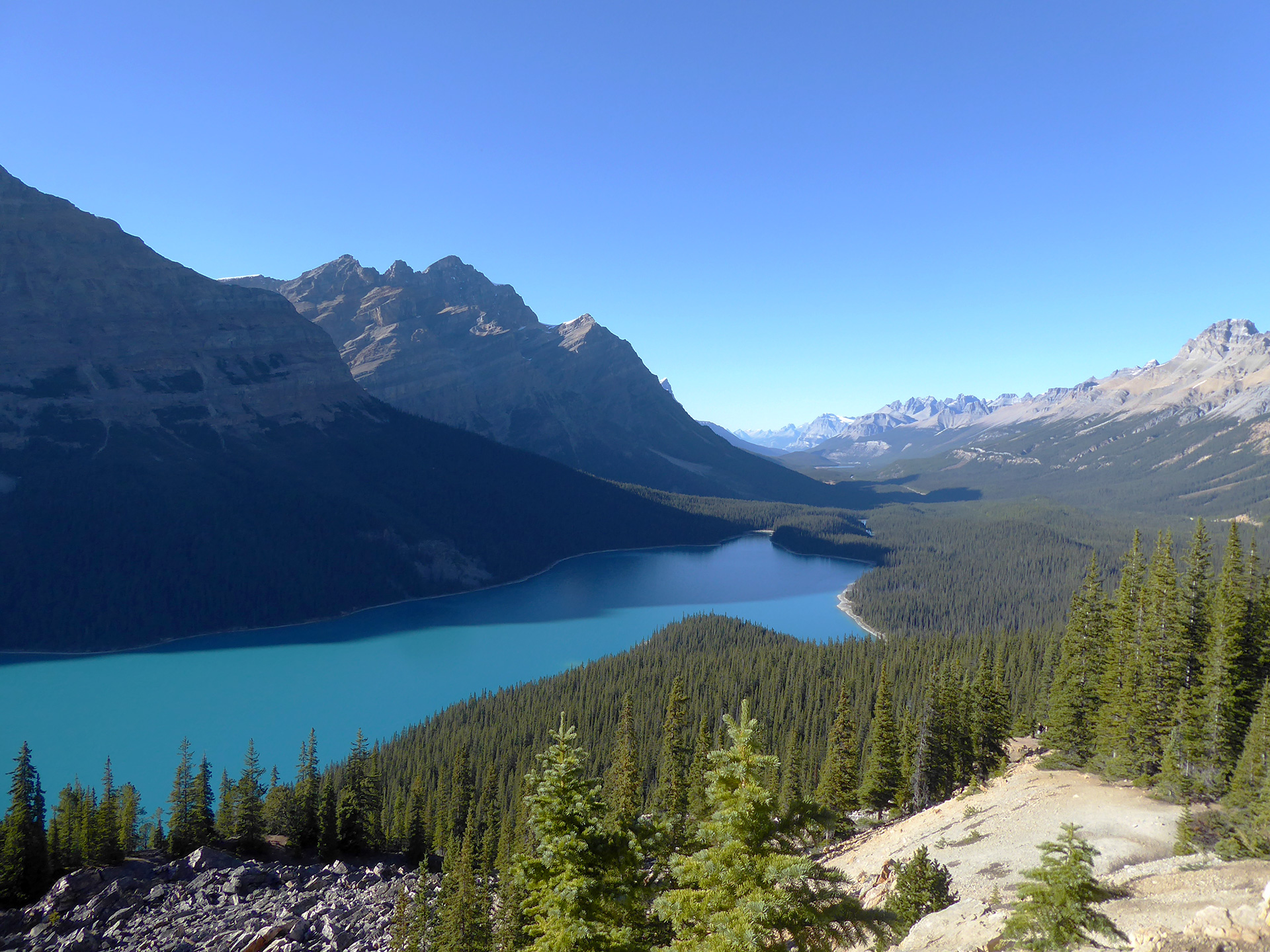 Auf dem Weg nach Lake Louise schlängeln wir uns entlang der Straße durch dicht bewachsenes Waldgebiet. Rechts und links von uns erheben sich schneebedeckte Berge, Seen tauchen auf und Lichtungen ermöglichen den Blick auf zerklüftete Flussgebiete. Leider ist das mit dem Fotografieren durch die Fensterscheiben gar nicht so einfach. Ein Großteil meiner Bilder ist verwackelt oder zeigt eine Spiegelung des Businnenraums. Schade, so kommt die wundervolle Landschaft nicht mal annähernd so eindrucksvoll rüber wie sie in Wirklichkeit ist. Aber gut, daran kann ich wohl oder übel auch nichts ändern. Die Bilder sind ja immerhin in meinem Kopf gespeichert. Nach Überquerung des North Saskatchewan River führt uns der nächste Halt zum Peyto Lake. Wow, das intensive blau des Sees fesselt meinen Blick. Die Natur versetzt mich immer wieder ins Staunen! So wunderschön es auch an den einzelnen Plätzen ist, heute habe ich erfahren, dass man an diesen beeindruckenden Naturschauplätzen aller Voraussicht nach nicht allein sein wird. Es ist hilfreich ein Bewusstsein dafür zu entwickeln, dass viele Touristen auf der bekannten Route in den Rocky Mountains unterwegs sind. Ich hatte zuvor noch die etwas naive Vorstellung in meinem Kopf, dass ich diese traumhaften Fleckchen in ihrer unberührten Schönheit genießen könne. Selbstverständlich habe ich es auch sehr genossen, aber eben in dem einen Moment zusammen mit vielen anderen Menschen. Bei einer Busreise bleibt das wohl nicht aus. Ist man mit einem Mietwagen oder Wohnmobil unterwegs gestaltet sich das Ganze schon deutlich flexibler. So lassen sich Stoßzeiten leicht "umfahren" und man kann sich beliebig viel Zeit für die Erkundung nehmen.
