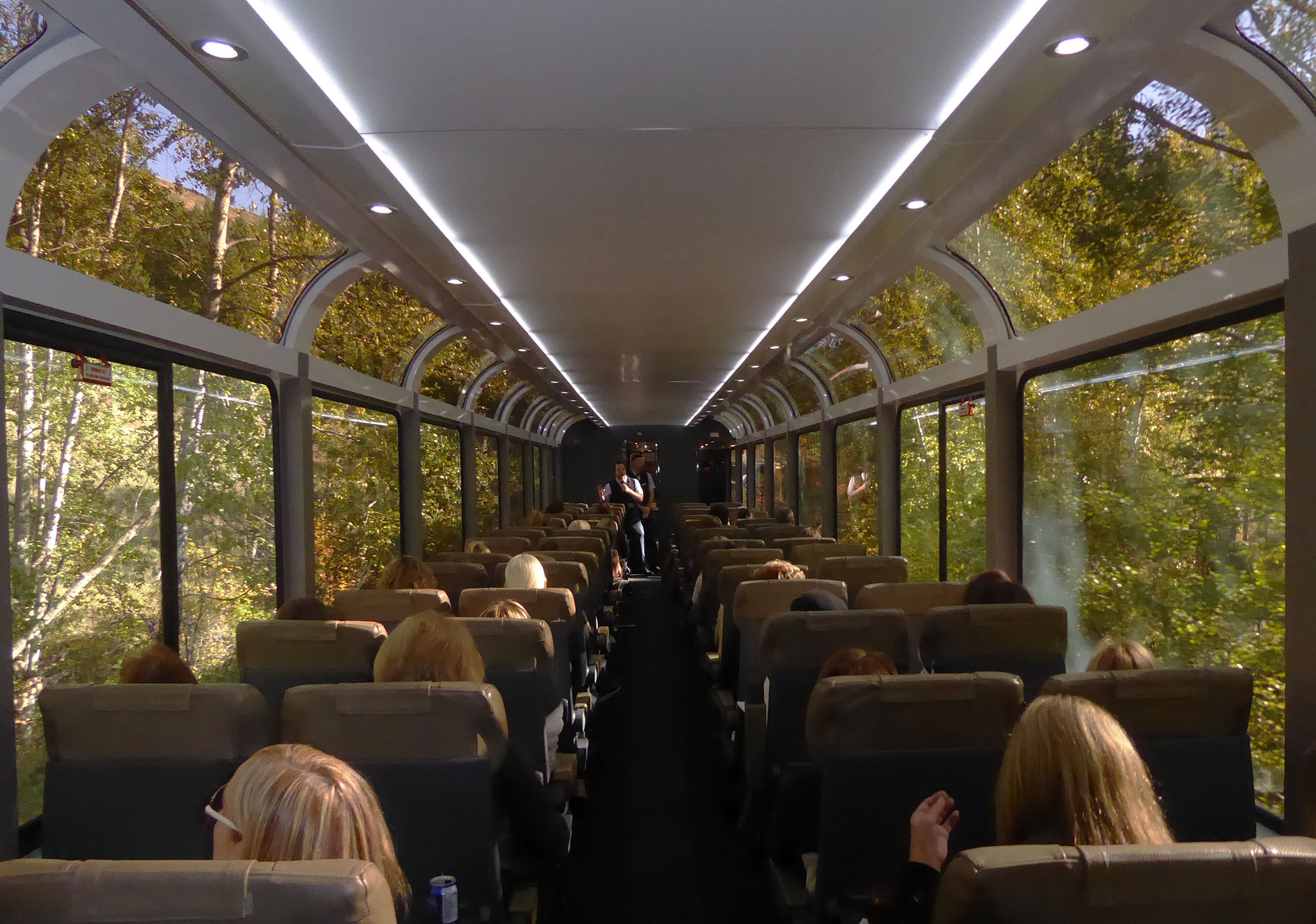 Die Unterschiede zur Gold Leaf Kategorie sind im direkten Vergleich deutlich zu erkennen. Der Wagon ist nicht in zwei Etagen unterteilt, sodass das Frühstück und Mittagessen am Platz serviert wird. Die Qualität des Essens ist sehr hochwertig, die Auswahl ist allerdings beschränkt. Während der gestrige Gold Leaf Wagon nahezu rundum Blick ermöglicht hat, sind die Panoramascheiben in der Silver Leaf nicht ganz so ausgeprägt. Trotzdem habe ich von meinem Platz aus alles im Blick und kann auch jederzeit aufstehen und durch das Abteil wandern. Obwohl ein deutlicher Unterschied zwischen den beiden Kategorien zu erkennen ist, fühle ich mich in der Silver Leaf Kategorie pudelwohl und bin begeistert. Entgegen meiner Erwartungen ist es auch heute möglich durch ein Fenster die Nase in den Wind zu halten. Obwohl ich den kleinen Balkon des Gold Leaf Wagons schon ein wenig vermisse.
