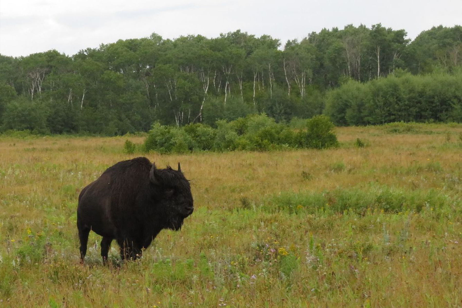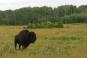 Der nächste Tag steht ganz im Zeichen von Tierbeobachtungen. Man hat uns geraten, möglichst früh zum Lake Aubry zu fahren, weil dann die Chancen hoch sind, die berühmte Bisonherde zu sehen. Schon auf dem Weg dorthin entdecken wir wieder einen Schwarzbären, der genüsslich Beeren vom Strauch pflückt. Von den Bisons ist zunächst nichts zu sehen, als wir einen Aussichtspunkt erreichen. Aber dann, bei der Weiterfahrt um eine Ecke treffen wir auf die ganze Herde von ca. 40 Tieren, ein urweltlicher Anblick! Dazu noch ein einzelner Büffel, der direkt neben der Straße im Gras liegt und sich im Staub wälzt. 1890 gab es nur noch wenige Exemplare, jetzt sollen es immerhin wieder 40.000 in ganz Kanada sein.