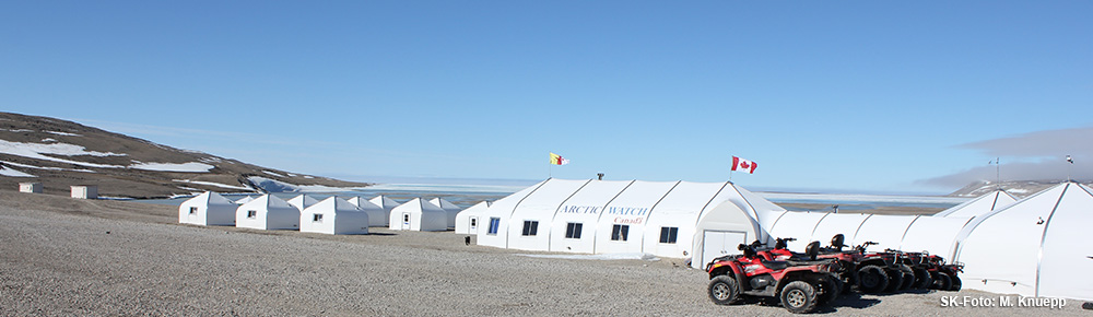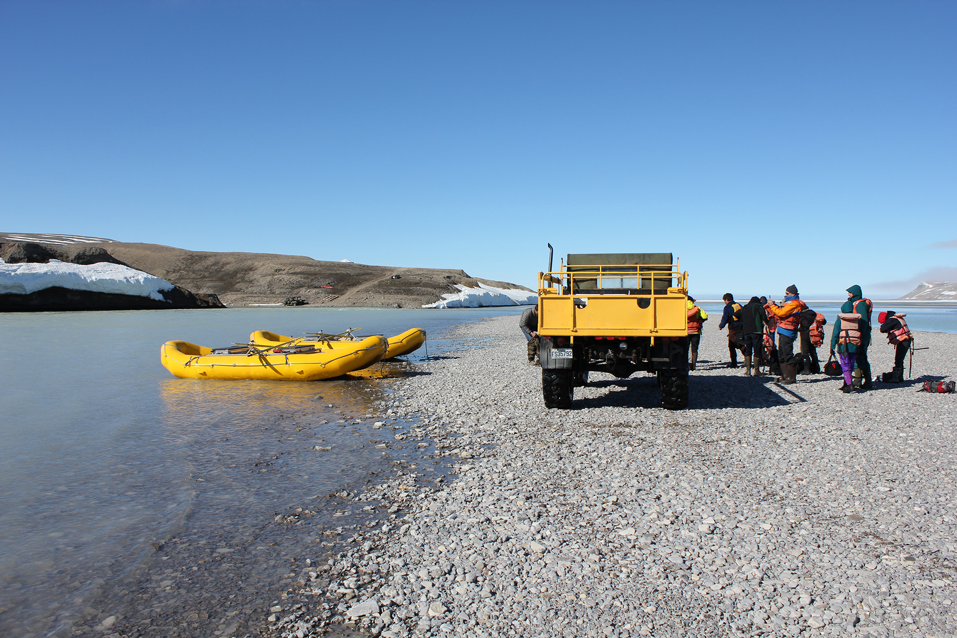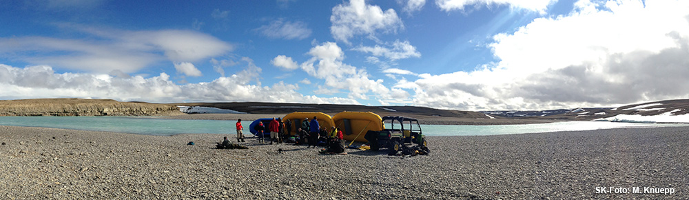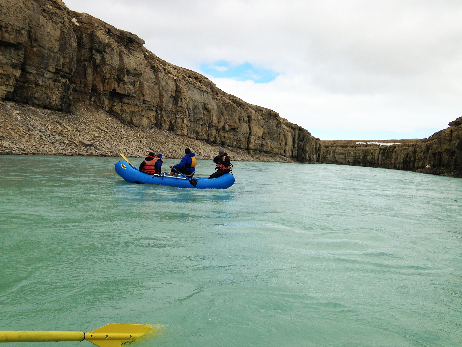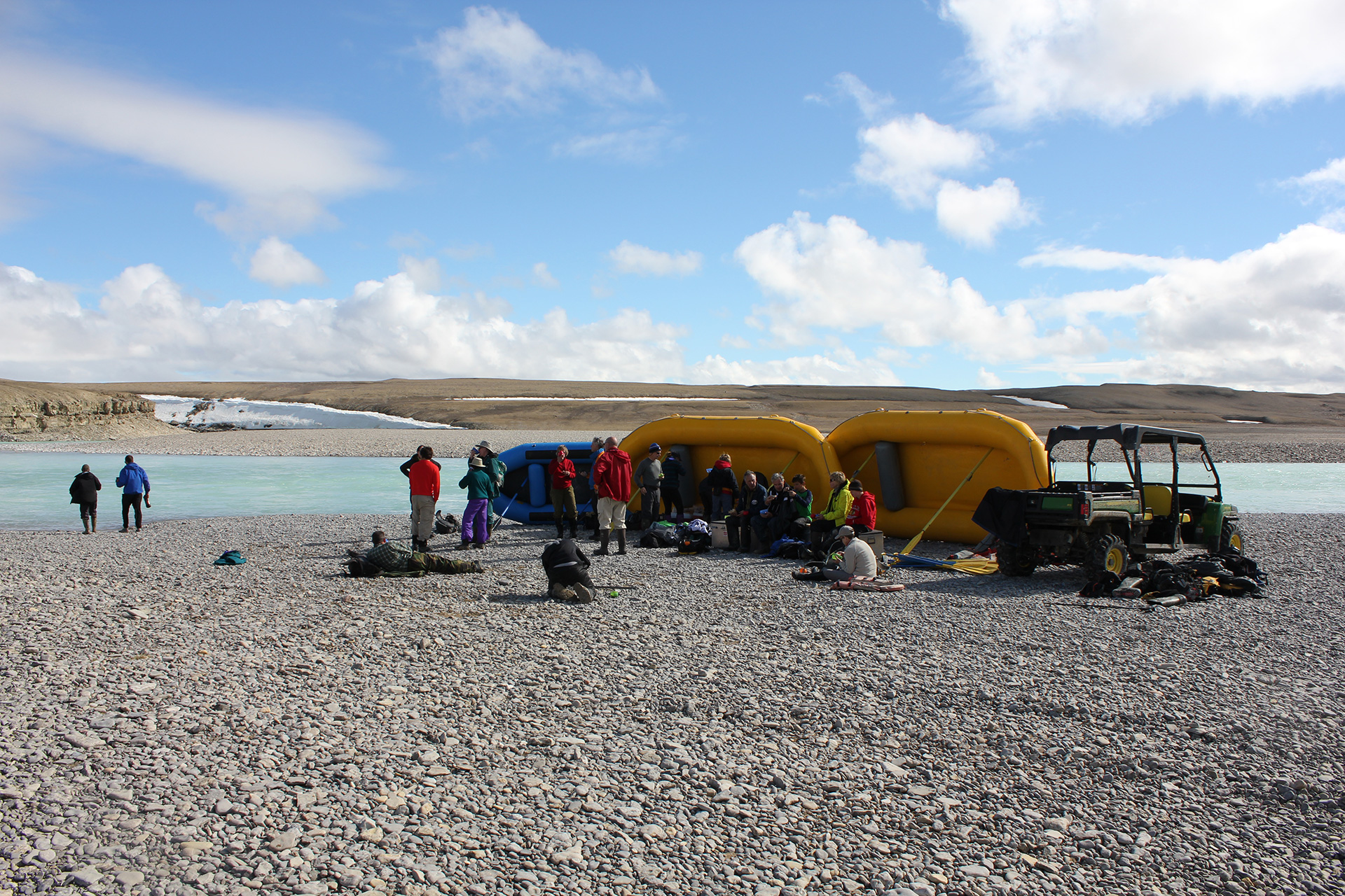 Wir warten auf die Belugas. Der Sommer hängt hier ca. 3 Wochen zurück, sodass noch zu viel Eis im Inlet ist. Eisbären und Robben konnten wir weit draußen auf dem Eis schon beobachten, aber noch keine Wale. Alsoheißt es Daumen drücken! Endlich wieder Sonnenschein und es wird wärmer, das sind hier in Nunavut immerhin 7 Grad. Ein traumhafter Tag: 1 Stunde ATV-Tour ins Inland, dann noch 2 Stunden zu Fuß weiter und nach der Mittagspause geht es mit Rafts auf dem Cunningham River zurück zur Lodge.