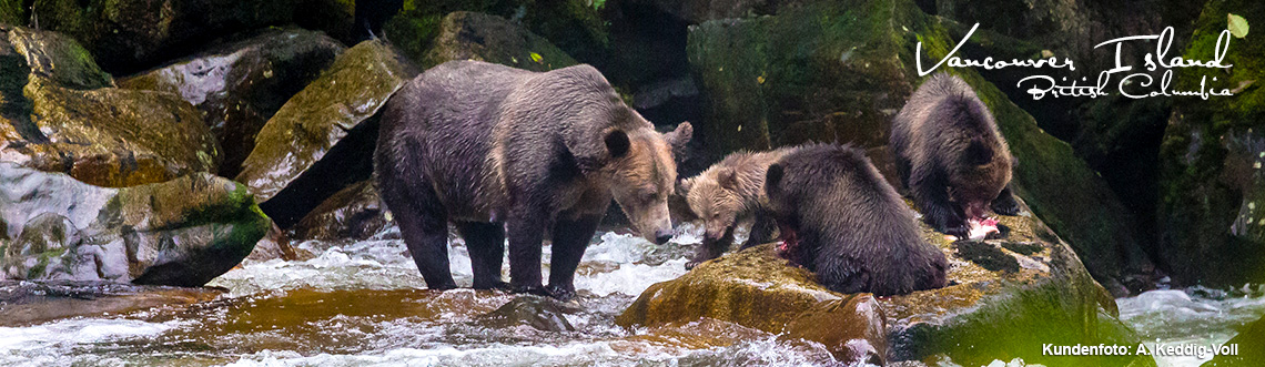 Was für eine faszinierende Insel! An ihrer Westküste gibt es weite Strände mit tosender Brandung, schroffen Felsen und tannenbestandenen Inseln. Vancouver Island ist ein Surferparadies - wer hätte das gedacht? Ein großer Teil der Wälder Vancouver Islands besteht aus Regenwald. Darin zu wandern, ist wirklich wie im Dschungel! Und in manchen Gegenden gibt es Mammutbäume, achthundert Jahre alt, die sind so hoch...! Vom Norden der Insel aus sind wir zu tollen Ausflügen per Boot aufgebrochen. Wir haben Wale gesehen (das wollte ich schon mein Leben lang!) und Delfine. Wir sind über die Johnstone Strait in den Thompson Sound gefahren, haben dort im Regenwald gehockt und Grizzlies beim Lachsefangen beobachtet! Und wir sind einen ganzen sonnigen Tag lang mit dem Boot durch die Schären gecruised. Sind von Robben beobachtet auf dem tiefblauen Wasser Kanu gefahren und haben in einer verschwiegenen Bucht den gerade gefangenen Fisch gebraten. Vancouver Island ist einfach fantastisch!