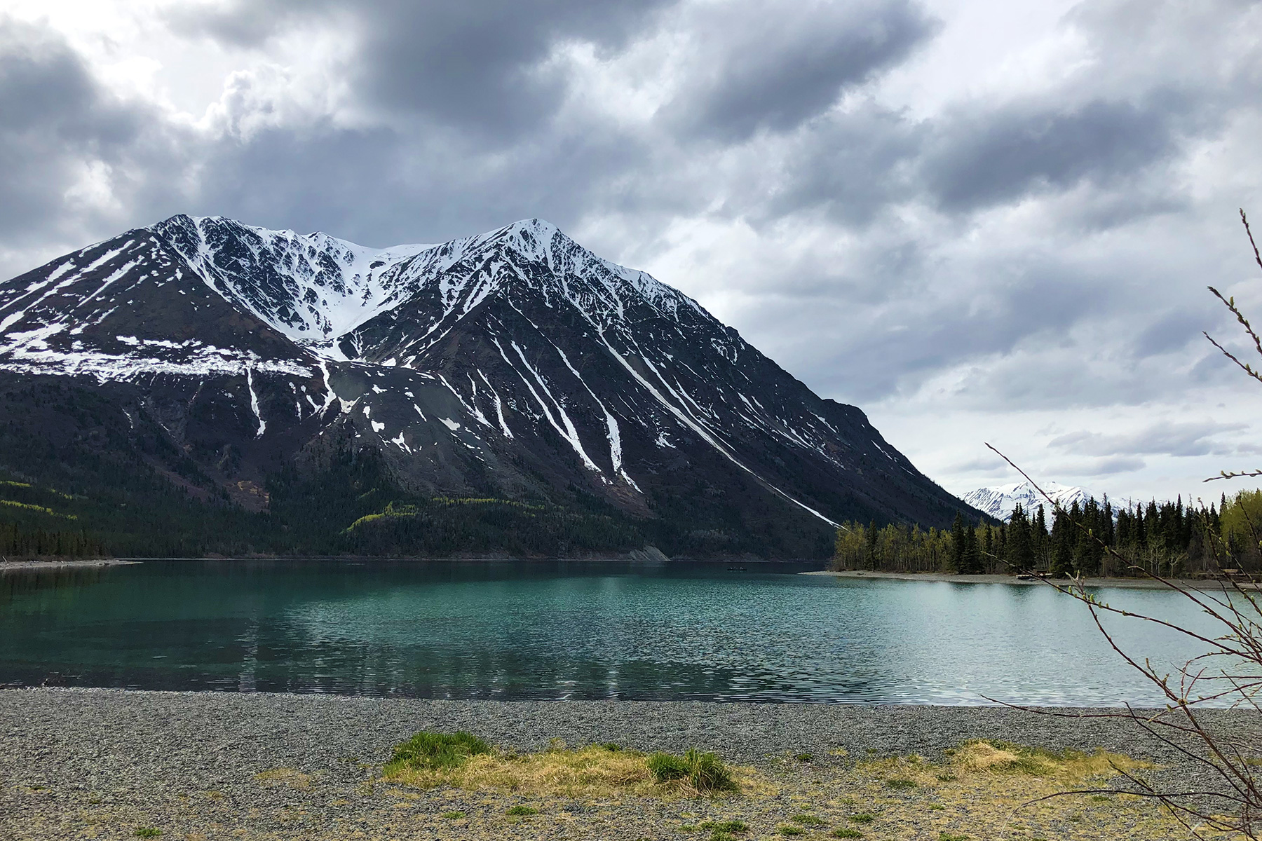 Kaum auf dem Highway, begegnet uns das erste Wildlife: Zwei Rehe verschwinden am Straßenrand im Wald – leider, bevor wir ein Foto machen können. Ist aber nicht schlimm: Das "Erfahren" des Highways an hat ordentlich etwas zu bieten. Links erheben sich Bergketten, rechts taucht bald der erste riesige See hinter Nadelbäumen auf. Anhalten und Fotografieren ist quasi Pflicht – und zwar eine, die immens Freude macht.