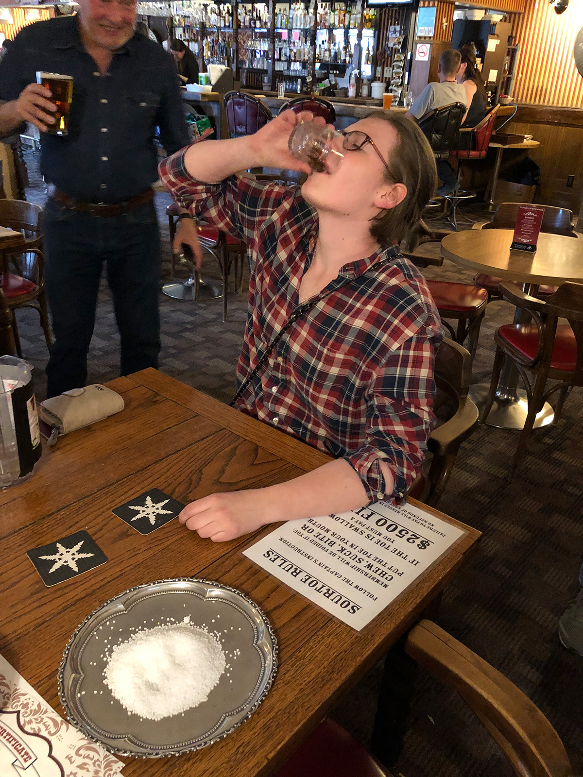 Ja, richtig gelesen. Auch wir treten heute dem absolut exklusiven Sour Toe Club bei. Das geht so: Man bestellt sich im Downtown Hotel einen hochprozentigen Shot mit mindestens 40 Umdrehungen. Wir entscheiden uns - klar - für Yukon Jack. Dann gehts zum Captain, einem Dawson City Urgestein und Hüter der Zehen. Der erklärt einem nochmal die Regeln. Kurz und knapp: Reinbeißen, Zerkauen und Verschlucken verboten. Und vor allem: Für eine vollwertige Mitgliedschaft muss der Zeh an die Lippen. Na dann Prost!