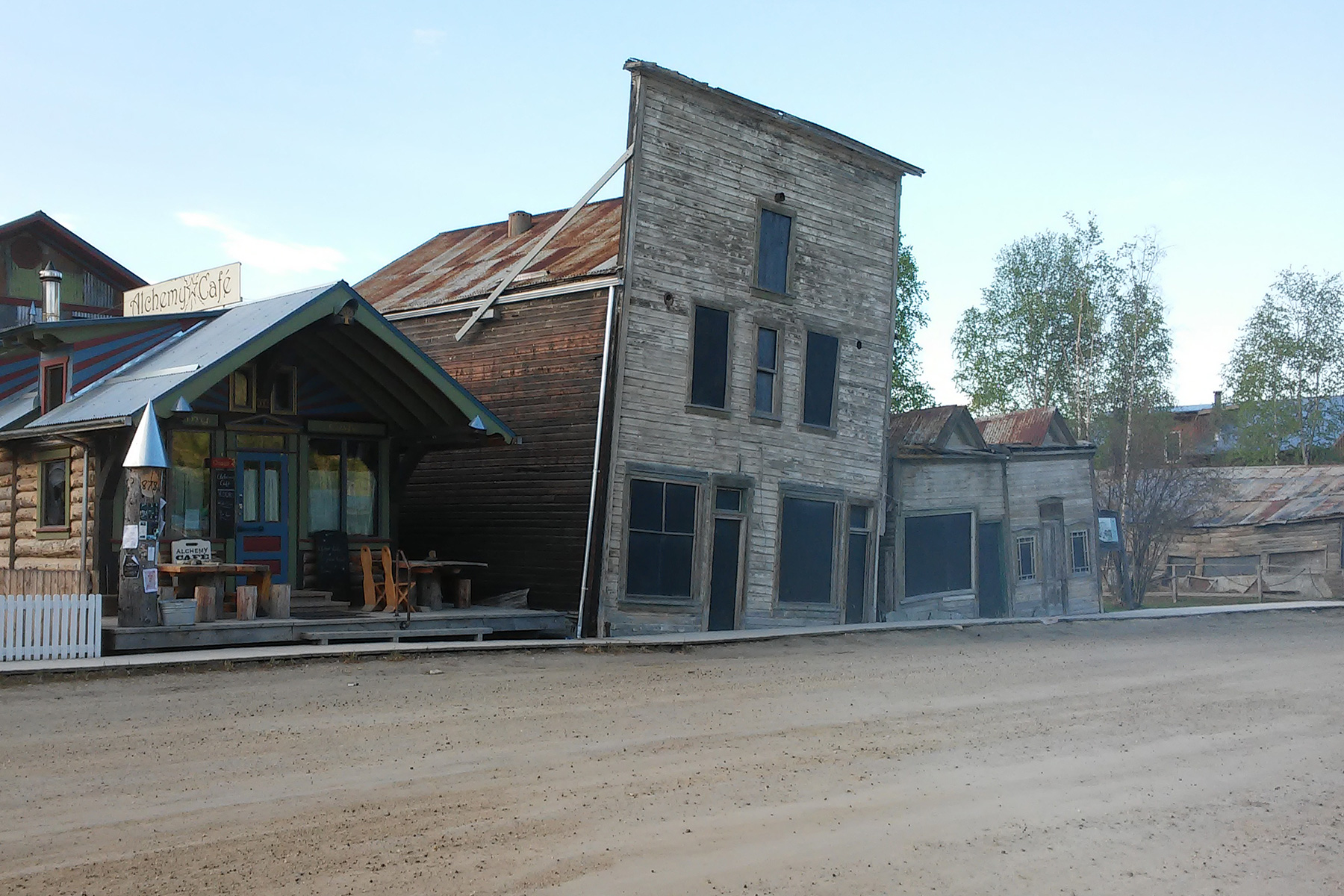 Im Kleinbus bekommen wir erst einmal eine Führung durch Dawson City. Der Stadt, die sonst eher einer Filmkulisse gleicht, wird durch die vielen Geschichten irgendwie Leben eingehaucht - super! Von den Landmarks entlang der Straßen sind uns einige schon bekannt, wie zum Beispiel das Downtown Hotel. Aber wir erfahren auch viel Neues, zum Beispiel zur Entstehung der sogenannten "Kissing Houses". Die zwei Gebäude sind im Zuge eines Feuers, das den Permafrostboden erwärmt hat, gegeneinander gesackt und halten sich nun gegenseitig vom Einsturz ab. Parks Canada sind die Eigentümer der Häuser, bewahren sie aber in diesem Zustand, anstatt sie zu restaurieren - einfach als Exempel, was der Permafrost verursachen kann.