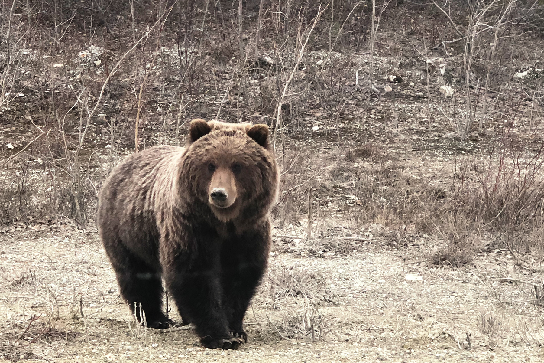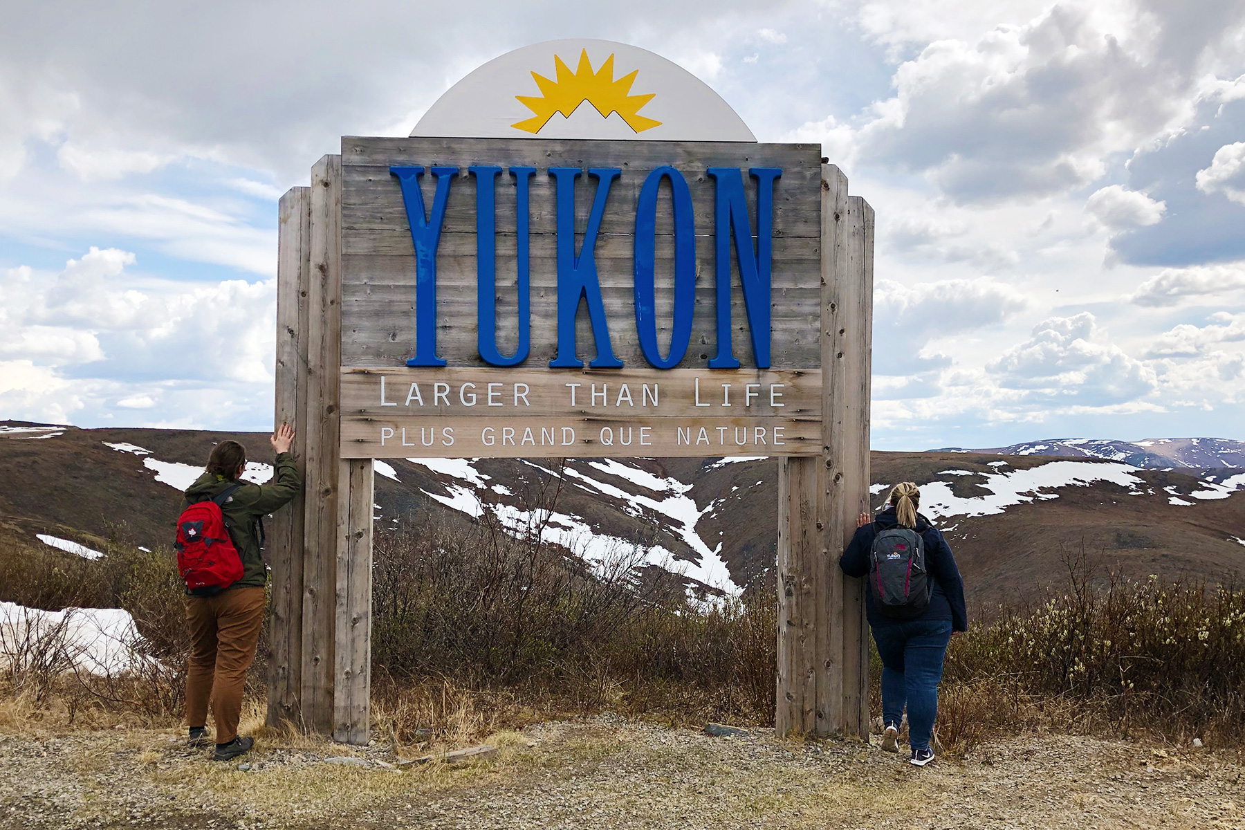 Die Grenzstation zu Alaska hingegen ist eher unspektakulär. Wir machen noch ein paar obligatorische Fotos vor dem "Yukon - larger than life" Schild und von uns, dann geht's auch schon wieder auf den Rückweg. Für einen ganz, ganz besonderen Moment sorgt dann noch unser erster Grizzly! Auf einmal steht er am Wegesrand, scharrt dort nach Wurzeln oder vergrabener Beute, und schaut uns interessiert an, als wir anhalten. Wir öffnen vorsichtig die Auto-Fenster und schießen ein paar super Fotos. Den Grizzly scheint unser kleines Fotoshooting zu interessieren. Plötzlich kommt er aufs Auto zu – schnell die Fenster wieder verschließen! Neugierig läuft der Bär ums Auto herum und beschnuppert einen Reifen. Während wir atemlos im Auto sitzen, schaut er noch kurz in die Rückfahrkamera. Dann widmet er sich wieder der Futtersuche. Wir bleiben noch einige Momente stehen, beobachten, sind ungläubig und freuen uns. Besser hätte unser Ausflug über den Top of the World Highway gar nicht enden können.