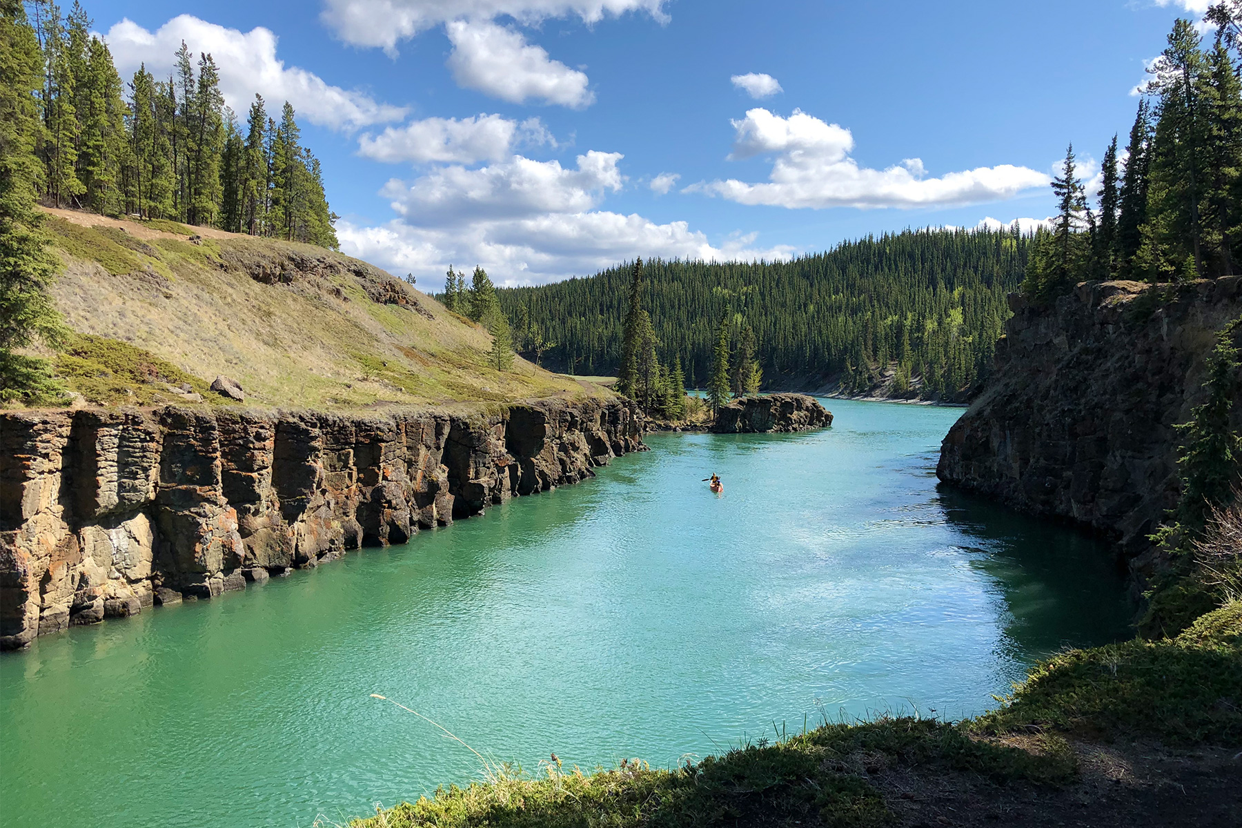 Unser erster Stopp: Miles Canyon. Ein Ort, der für die Geschichte des Goldrauschs eine besondere Bedeutung hat, wie wir von Holger erfahren. Wir wandern entlang des türkisblauen Yukon Rivers zu den Überbleibseln der Siedlung Canyon City. Zu Goldgräberzeiten legten viele Pioniere hier eine Rast ein, bevor sie dem Ruf des Goldes weiter nach Alaska folgten. Von dem einst boomenden Ort ist heute bis auf einige Blechdosen nichts mehr übrig geblieben. Am Ufer des vorbeiströmenden Flusses erfahren wir mehr über die Menschen, die auf dem Yukon River ihr Glück suchten. Ein Hauch Goldgräbergeschichte liegt in der Luft.