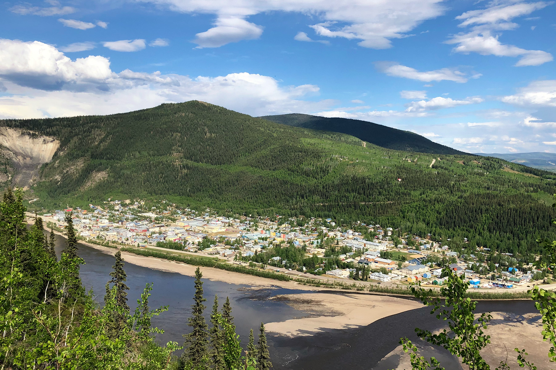 Mit etwas Gold in den Taschen machen wir uns am nächsten Morgen auf den Weg zurück nach Whitehorse. Schade eigentlich, denn irgendwie ist Dawson echt liebenswert. Insbesondere die alten, bunten und teilweise komplett schiefen Häuser. Um einen letzten Blick auf die alte Goldgräber-Stadt zu werfen, fahren wir auf den Midnight Dome. Eine super Aussicht auf Dawson und die Stelle, an der der Klondike und Yukon River zusammenfließen.