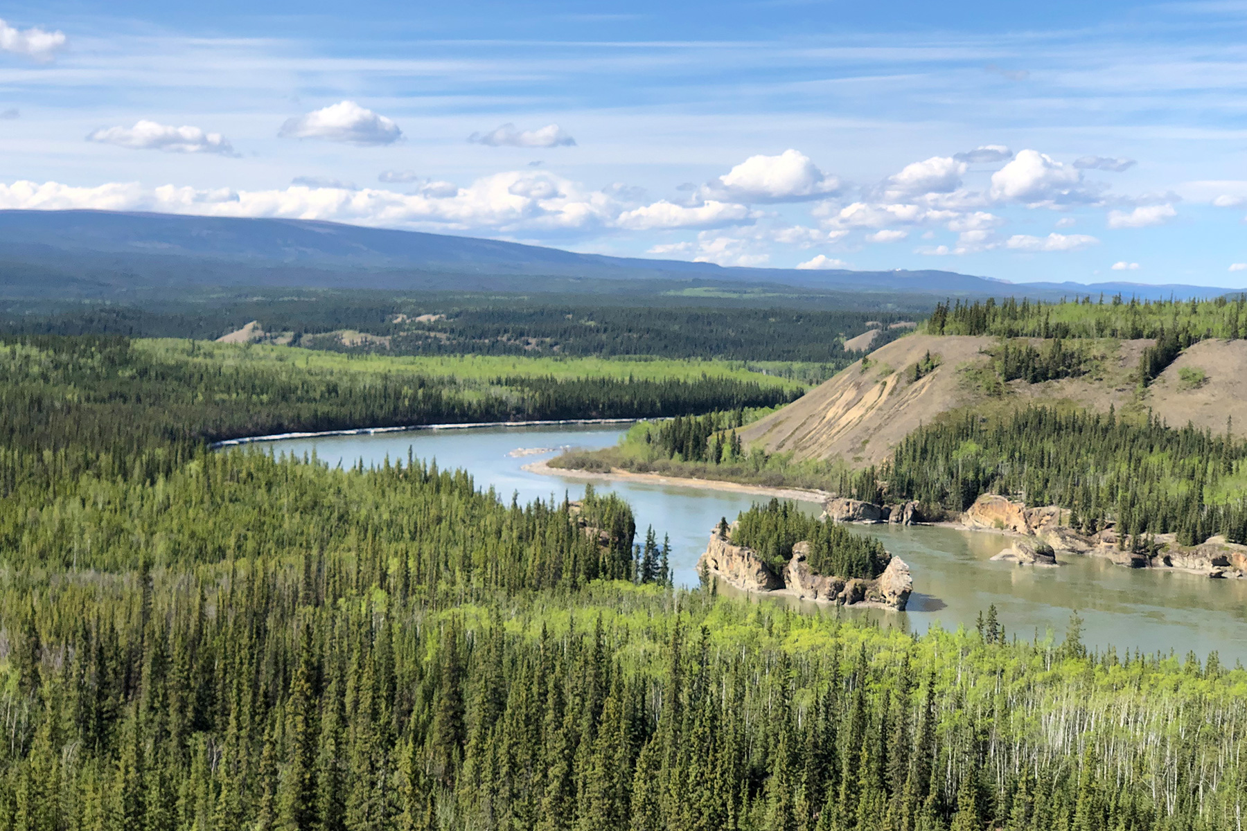 Und dafür legen wir gern einen Frühstart hin: Punkt acht Uhr haben wir den Klondike Highway unter den Rädern. Auf ins legendäre Dawson City! Bereits nach wenigen Kilometern wird klar, was den Yukon unter anderem so spektakulär macht: Die Landschaft ist unglaublich vielseitig. Statt der rauen Bergklippen, die wir gestern den ganzen Tag vom Alaska Highway aus gesehen haben, sind die Hügel hier sanfter und die Vegetation grüner. Am Rand der Straße wächst büschelweise Löwenzahn, eine Leckerei für Grizzlies und Schwarzbären.