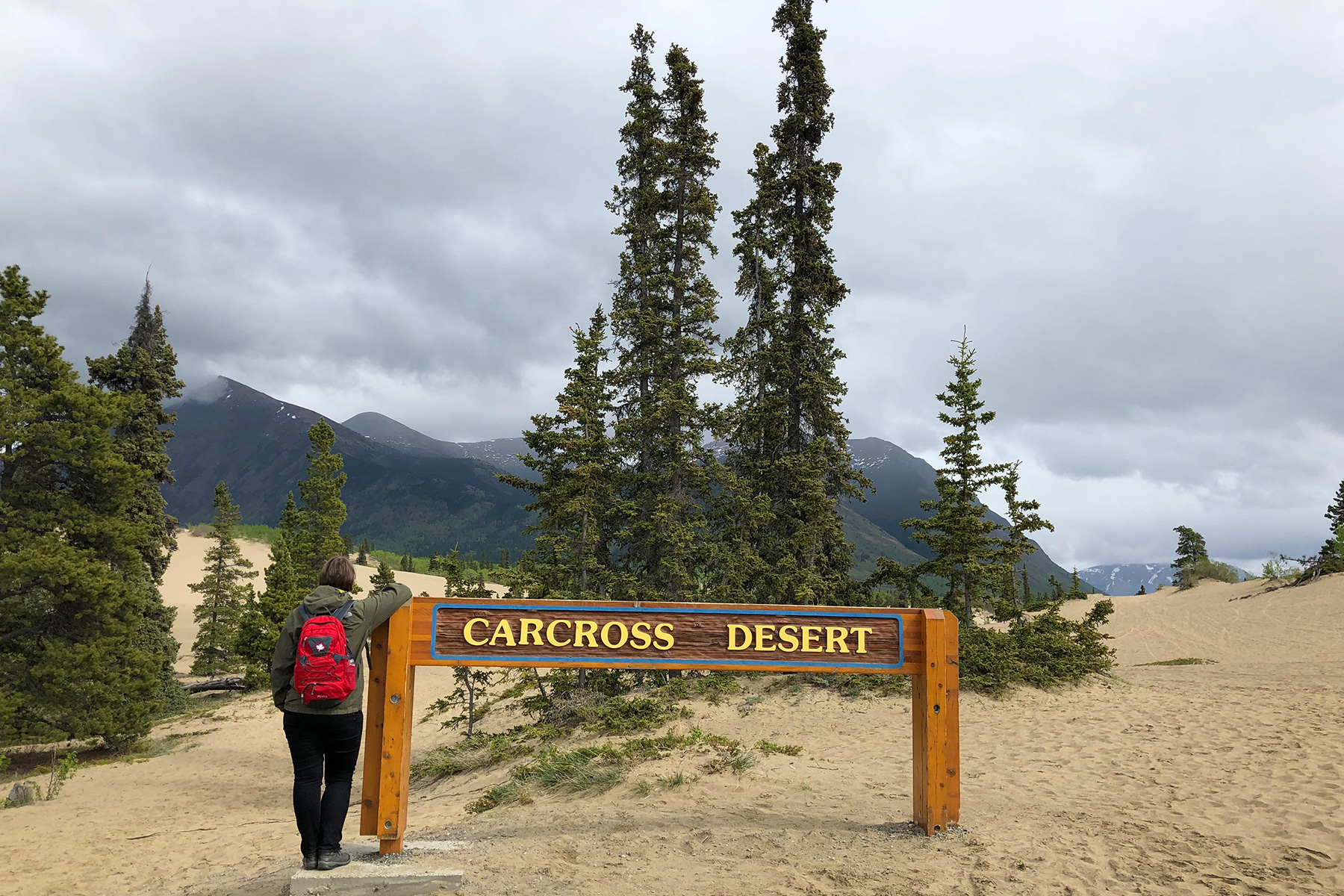 Auf Dessert folgt Desert. Wir schlagen den Weg nach Carcross ein. Bekannt ist der kleine Ort besonders als Stopp der Whitepass und Yukon Route, und für die Wüste. Ja, richtig gehört. Ein Flecken feinster Sand, in dem Nadelbäume wachsen, im Hintergrund die so Yukon-typischen Bergketten.