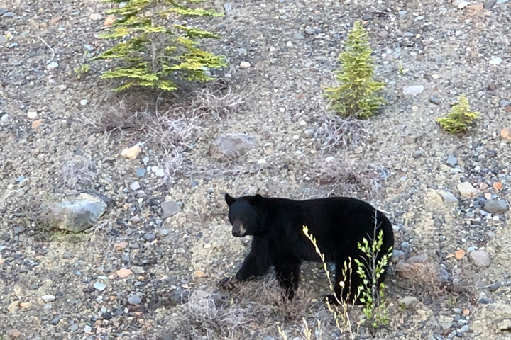 Am Fox Lake sehen wir uns das erste Mal zum Anhalten gezwungen – denn der Ausblick ist einfach zu schön, um daran vorbeizudüsen. Füchse sehen wir hier zwar keine, aber dafür wartet nach der nächsten Kurve ein Wildife-Highlight auf uns: Am linken Straßenrand verschwindet eben ein junger Schwarzbär im Dickicht, aufgeschreckt durch das große Motorhome vor uns. Pech gehabt – oder? Auf Holgers Anraten bleiben wir mit laufendem Motor stehen und warten ab. Und tatsächlich taucht der Bär nach einigen Momenten wieder am Highway-Rand auf - als hätte unser "Bärenflüsterer" Holger ihn dorthin bestellt. Ruhig trottet das schöne Tier über den Highway, klettert behände den Steilhang hinauf und taucht schließlich zwischen Bäumen unter - nicht, ohne uns noch den ein oder anderen neugierigen Blick zuzuwerfen. Einfach nur wow.