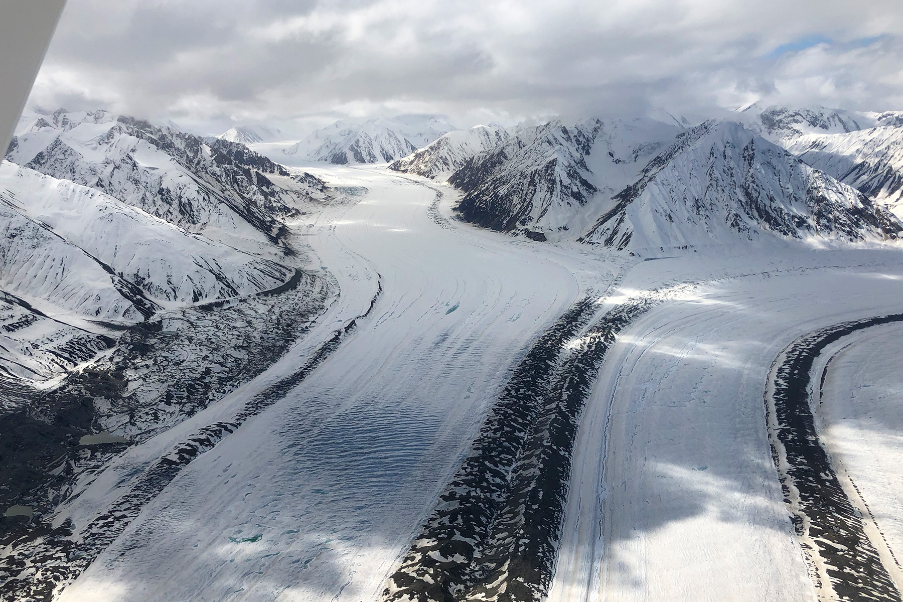 Jetzt aber aufs Gaspedal gedrückt, denn wir wollen hoch hinaus. Mit dem Buschflugzeug ab in die Lüfte und hinein in den Kluane Park. An dieser Stelle würden wir eigentlich gern einfach aufhören, zu beschreiben. Weil es kaum geht. Es gibt keine treffenden Worte für das Gefühl dort oben, während wir über die strahlend weißen Icefields fliegen, vorbei an zerklüfteten Bergspitzen in ganz verschiedenen Farben und über weite Wälder. Hinter einem besonders dramatischen Bergpanorama taucht plötzlich blau und türkis schimmernd der Kluane Lake auf. Ein Bild wie im Film - nur besser, weil echt und direkt unter uns. Wahnsinn!