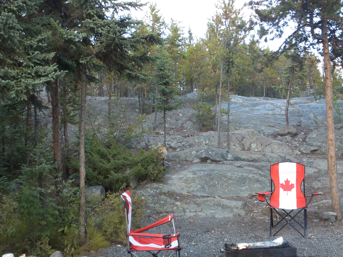 Am Morgen war es kalt im Camper, Heizung ging nicht also habe ich die Gasflammen angemacht, wir haben gut gefrühstückt und überlegt was wir machen. Wir waren ja schon so oft in Canada unterwegs, hatten aber noch keine solchen Probleme, aber es geht immer weiter. Wir wollten im ersten Moment nach Yellowknife zurück, aber wohin, Handy geht hier nicht und ich kann mich zwar gut verständigen wenn ich den Menschen persönlich gegenüberstehe, aber am Telefon?, Also wir los, der Wagen startete gut, also wir schon auf dem Weg zurück, plötzlich dachten wir, normal lädt sich die Batterie beim Fahren auf. Wir haben gewendet und sich den Ingraham Trail bis ans Ende gefahren, haben Wasserfälle besucht z.B. den Cameron Fall und auf der Rückfahrt hat ein Polarfuchs unserer Straße gekreuzt, konnte ihn gut fotografieren. Die Nacht haben wir dann in Yellowknife auf dem Fred Henne Territorial Park mit Power verbracht. Unser Abendessen wurde jeden Abend auf offenen Feuer bereitet, das ist doch klar oder? Auch an diesem tollen sonnigen Abend und als wir beim Essen saßen kam ein Fuchs ans Feuer, hat sich auch für ein Foto bereit gestellt.