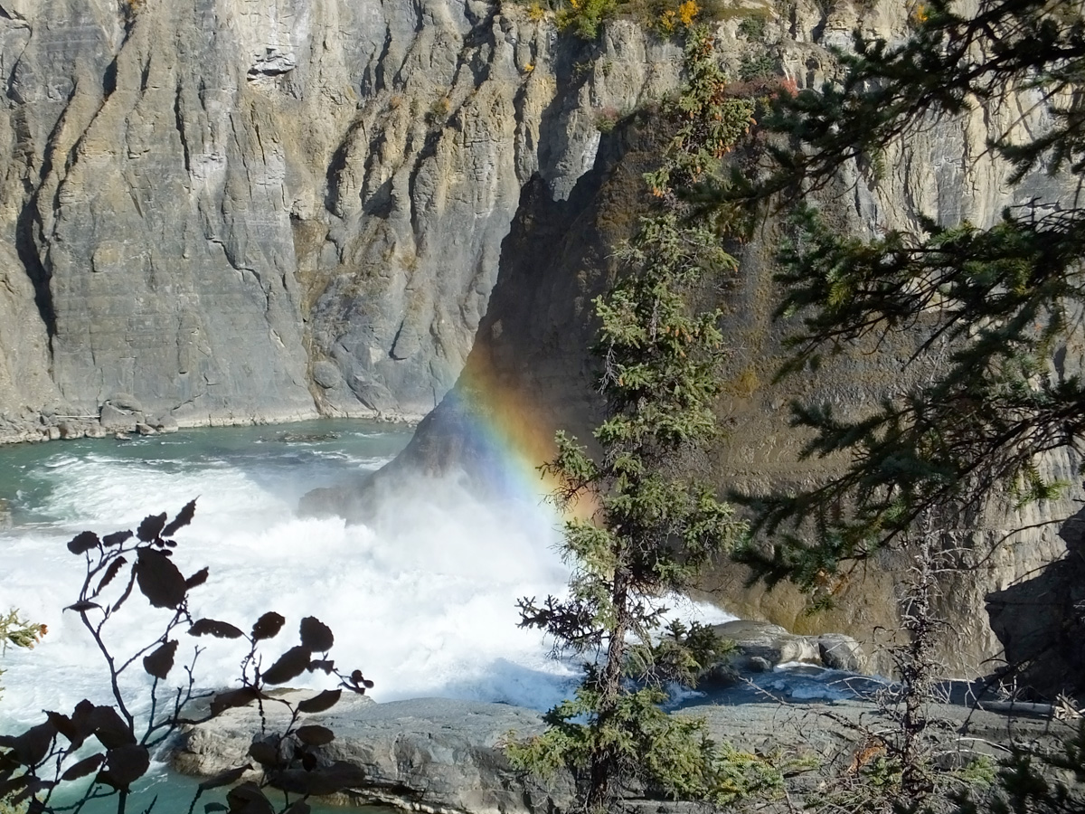 Morgens erst die Schotterfahrt über die Parkstraße. Stop an den Helmcken Falls. Wir sind ganz allein. Haben die 140 Meter hohen Fälle ganz für uns. Ach, und Sonne und blauer Himmel - hatte ich das schon erwähnt?
