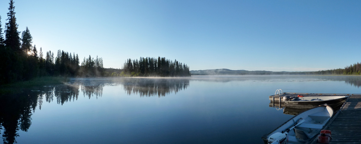 Um 5 Uhr stehen Felix und ich auf und wir treffen uns draußen am Steg mit Sven, Lili und Lennart. Wir nehmen uns eines von den kleinen Motorbooten und tuckern auf den See hinaus - zur Pirschfahrt. Ein tolles Erlebnis mit den Morgennebeln über dem See - übrigens wieder tolles Wetter.. Tja, den Elch finden wir nicht, aber wir können einen Fischadler super fotografieren und die Loons (Eistaucher) bieten uns eine tolle Schwimm- und Tauchshow mit Konzert.