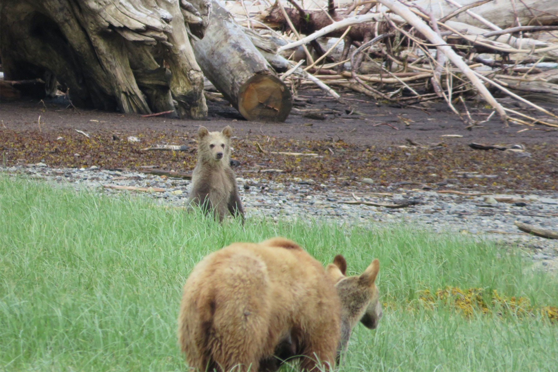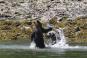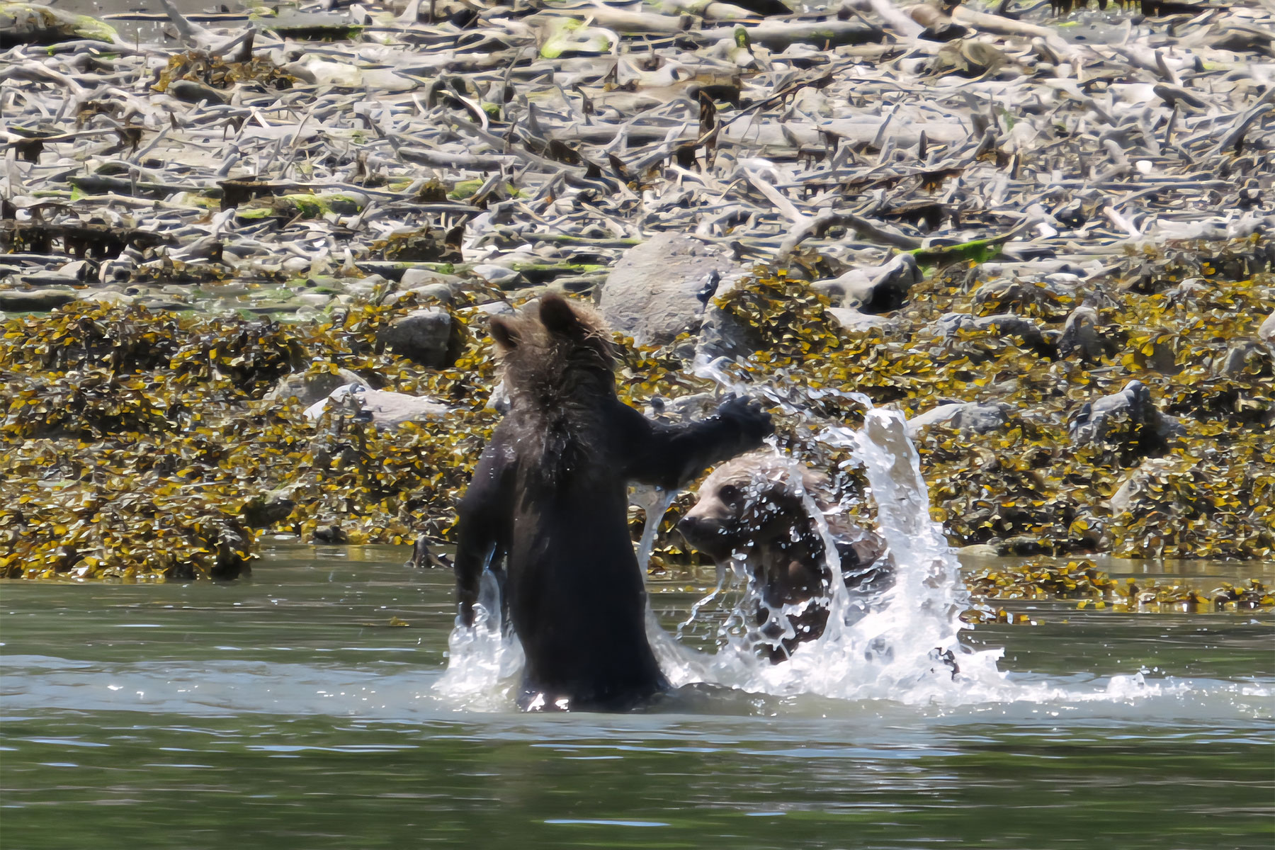Am nächsten Morgen schippern wir mit Tide Rip Beartours in die Buchten der Glendale Cove, um Grizzlys zu beobachten. Wir sind eine kleine Gruppe und werden gleich vor der Bucht von einem Orca begrüßt. Ebenfalls hat eine Gruppe Seelöwen lautstark etwas zu sagen, die wir, auf einem Felsen sitzend, passieren. Als wir ein paar Seehunde gefunden haben, passiert lange Zeit nichts und wir befürchten schon, das wars. Zum Glück nicht. Am Ende der Bucht von Glendale Cove entdecken wir sie. Es sind wirklich 2 Grizzlymütter mit ihren jeweils zwei Kindern. Sie sind den Guides durch das Bärenschutzprogramm bekannt. Es sind Lilian mit ihren beiden Jungbären aus 2024 und Thimble mit den Baby aus April 2025. An den beiden Familien kann man gut sehen, wie unterschiedlich Bären aussehen können. Grizzly ist nicht gleich Grizzly. Das Besondere an unserer heutigen Tour ist: wir haben Zeit! Es ist kein Hinfahren, Fotos machen, wegfahren. Sondern wir haben ausgiebig Zeit, in Ruhe zu beobachten. Das wissen wir zu schätzen. Erst zieht sich Thimble bei unserem Besuch etwas in die Böschung zurück, so dass wir bei Lilian bleiben, die Hunger hat und am Ufer nach Krebsen und anderen Kleintieren sucht. Dabei posiert sie ein paarmal extra für uns. Na ja, vielleicht hat sie auch überlegt, ob wir heute Freund oder Feind sind. Ihre Kinder sehen aus wie Teenies, schlacksig, noch kleiner, aber nicht mehr babyhaft. Sie machen schon vieles ohne ihre Mutter, gehen eigenständig auf Futtersuche, tollen herum. Als ihre Beiden müde werden und sich ins hohe Gras legen, versuchen wir es noch einmal bei Thimble, die inzwischen wieder ans Wasser gekommen ist. Es ist ein warmer Tag heute und sie will sich abkühlen. Dabei läßt sie uns nun gnädig zuschauen. Ihre Baby sind da viel aufgeweckter. Neugierig stellen sie sich auf die Hinterbeine und beobachten uns. Es sieht zu drollig aus. Dann laufen sie ihrer Mutter hinterher ins Wasser und eine Wasserschlacht beginnt. Wie zwei Kinder springen sie durchs Wasser, lassen sich fallen, platschen mit den Tatzen ins Wasser, um den anderen nass zuspritzen und wieder aufs Neue. Wir sind sprachlos, unsere Fotoapparate verstummen. Es ist zu schön, um nicht einfach zu erleben, wie die Beiden hier spielen. Irgendwann hat Thimble sich genug gebadet und verlässt das Wasser und damit ist das Badespiel auch beendet. Es ist Nachmittag geworden und auch für uns ist es an der Zeit, umzukehren. Was für ein Tag! Damit hatten wir bei der Buchung nicht gerechnet.