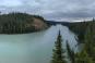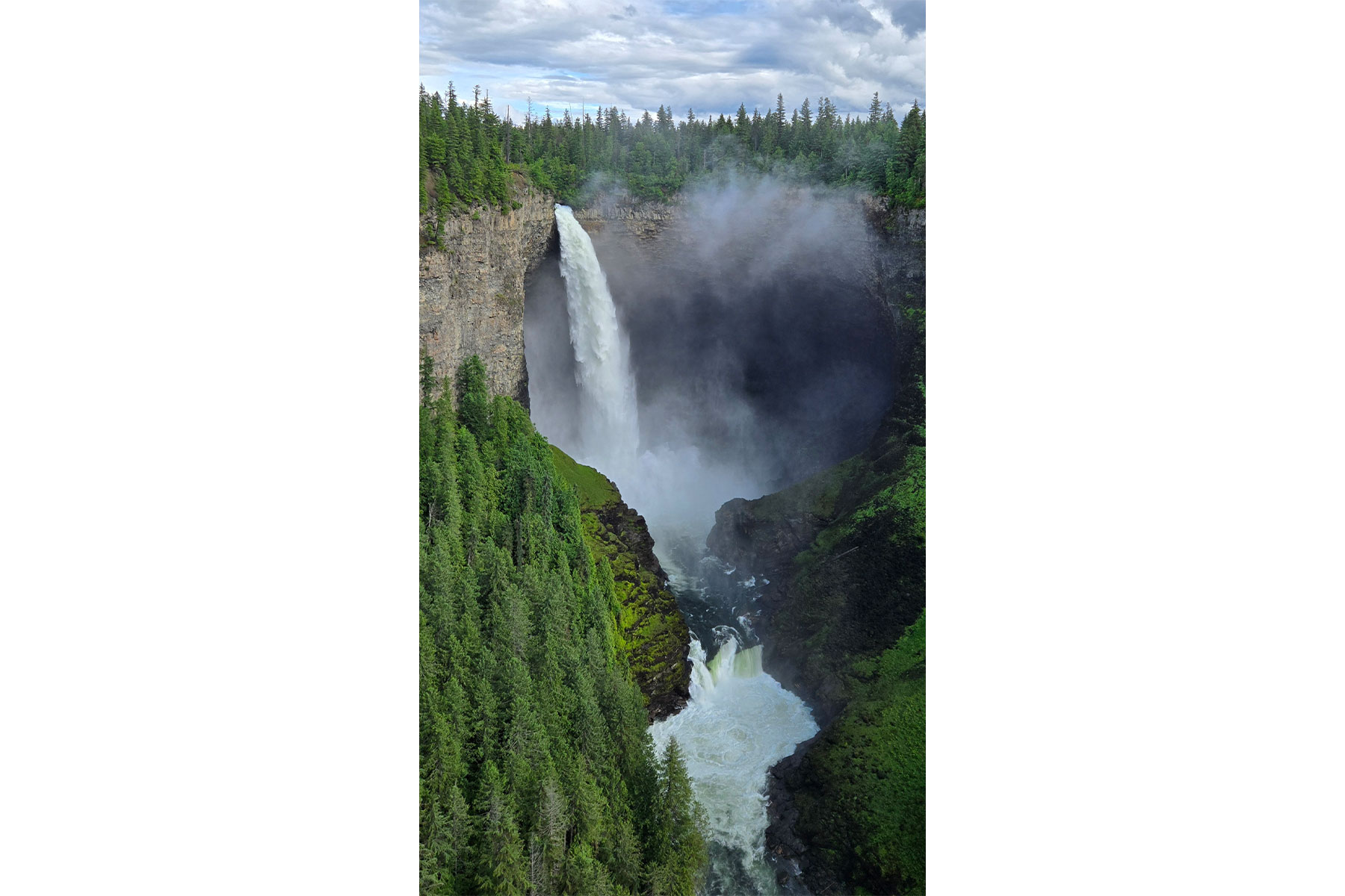 Über Revelstoke gelangen wir nach Clearwater im Herzen des Wells Gray Provincial Park in British Columbia und verlassen damit Alberta. Und lassen damit auch für ein paar Tage die Gegenwart zurück. Clearwater war damals unser Haupt Dreh- und Angelpunkt der Hochzeitsreise. Wir wollen auf die Spuren der Vergangenheit gehen, unsere Vergangenheit. Als wir in Clearwater hineinfahren, werde ich ganz hibbelig. Vieles erkenne ich wieder, einiges ist neu. Sofort weiß ich, wo das Visitorcenter ist, der alte Einkaufsladen, die Straße zur Ranch, zum Fluß und den Helmcken Falls, aber auch noch den Weg zum Dunn Peak, komisch wie präsent manche Dinge bleiben, obwohl es so viele Jahre her ist. Noch bei der Ankunft fängt es an zu regnen. Dennoch hält es uns nicht davon ab, zu den Helmcken Falls hinauszufahren. Die Brücken auf der Straße sind weiter ausgebaut worden zu meiner Beruhigung, das war damals echt noch etwas abenteuerlicher. Am Wasserfall angekommen führt ein kurzer Pfad vom Parkplatz zum Ziel. Aus dem einfachen Holzgestell von damals ist eine solide, etwas höher gelegene Aussichtsplattform aus Metall geworden. Das Wasser stößt mit enormer Energie aus dem schmalen Schlot des Felsens und fällt 142 m tief in den Trichter. Die weiße Gischt schäumt wie dichter Nebel. Am Grund ist alles knallgrün bewachsen mit Moos und Gräsern. Hohe Felswände ragen zu beiden Seiten empor und bilden den Canyon. Man erkennt deutlich wie die Kräfte hier den Trichter weiter aushöhlen. Ein herrliches Spektakel.