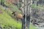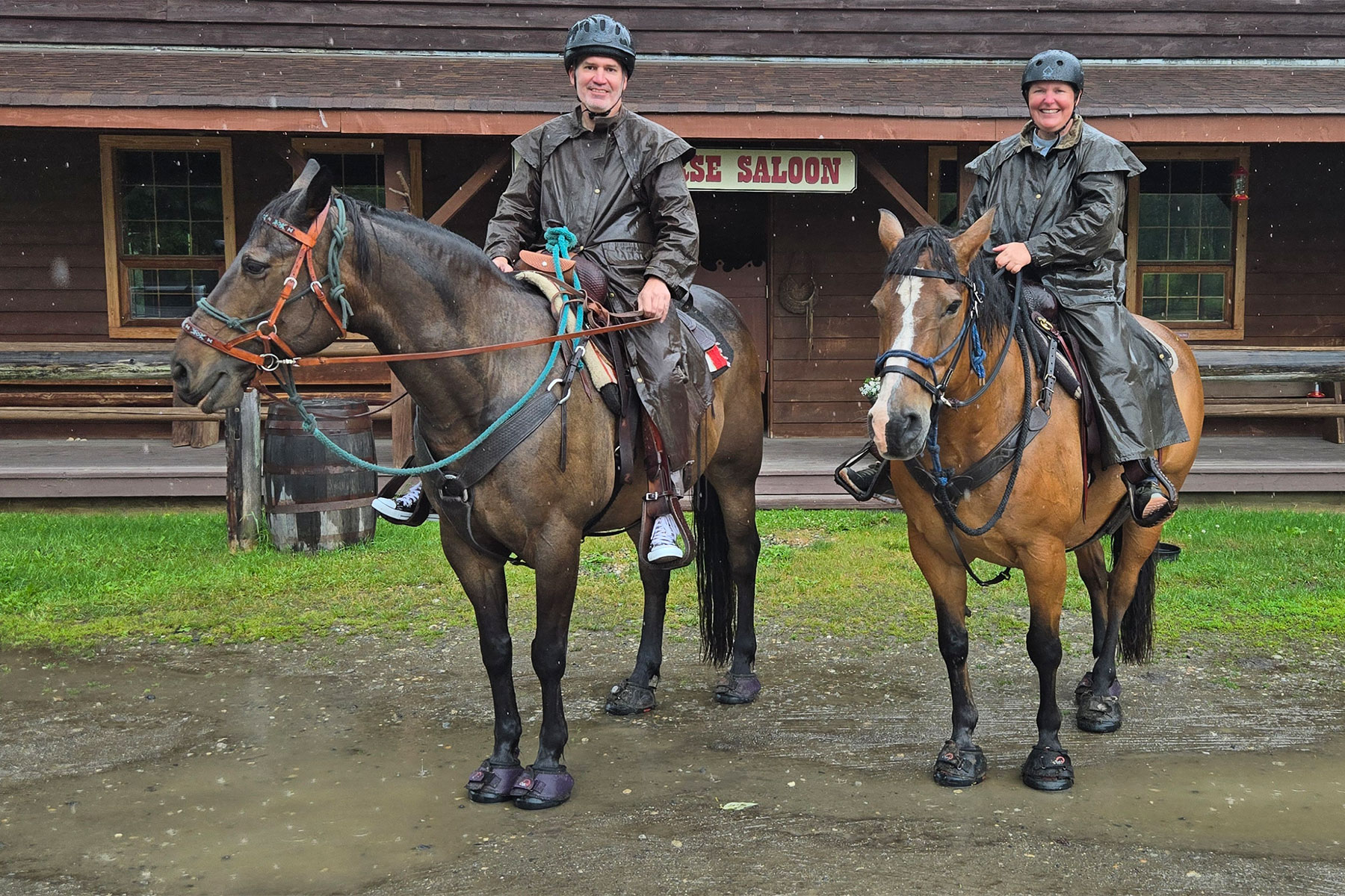 Wir besuchen die Wells Guest Ranch am nächsten Morgen bei strömenden Regen. Dort haben wir damals eine Reit- und Kanutour gemacht. Kanufahren wird nicht mehr angeboten, so dass wir uns eine Tagesreittour gebucht haben. Es kam keine Absage, also gehen wir davon aus, auch bei Regen zu reiten. Nun gut, es gibt kein schlechtes Wetter, nur unpassende Kleidung. Wir erreichen die Ranch. Sie sieht noch genauso aus, wie damals. Nur die Besitzer haben gewechselt. Wir quatschen ein wenig über die letzten Jahre und dann kommen auch noch die weiteren Teilnehmer. Eine Mutter und ihr Sohn, beide unsicher, ob sie bei dem Wetter wirklich reiten möchten. Die Pferde werden verteilt, wir werden mit Wachsmänteln gegen den Regen ausgestattet und ich rechne es meinem Mann echt hoch an, dass er das schon wieder mitmacht, denn zugegeben reitet er sonst nie und nur für mich. Unser Weg führt aufgrund des Wetters nicht hinunter zum Fluss, da die Wege zu rutschig sind, stattdessen geht es in die Wälder. Wir queren quirlige Bäche, erklimmen kleine Böschungen und entdecken Birkenstämme mit Spuren von Bärenkrallen darauf. Der Regen tropft nicht nur von der Reitkappe herunter, als wir schließlich wieder an der Ranch ankommen. Mutter und Sohn sind schneller im Auto verschwunden, als wir es mitbekommen können. Wir machen noch einen Rundgang über die Ranch, zu den kleinen Cabins, in den Saloon und stellen vor dem Haupthaus noch ein altes Foto nach, was ich heraus gekramt habe. Damals – heute. Als wir auf dem Weg zurück nach Clearwater sind, brauchen wir keinen Scheibenwischer mehr… That´s nature. Wir nehmen es mit Humor. Zumindest ermöglicht dieser Umstand uns, am späten Nachmittag noch den Bailey´s Chute zu wandern. Der Rundweg führt durch den Wald zu drei Wasserfällen und einem stillen See. Ein Wanderpfad voller Gegensätze, von tosenden Wasserfällen, durch Dickicht und riesige Zedernbäume zu dem verträumten See, den man über einen Steg überquert.