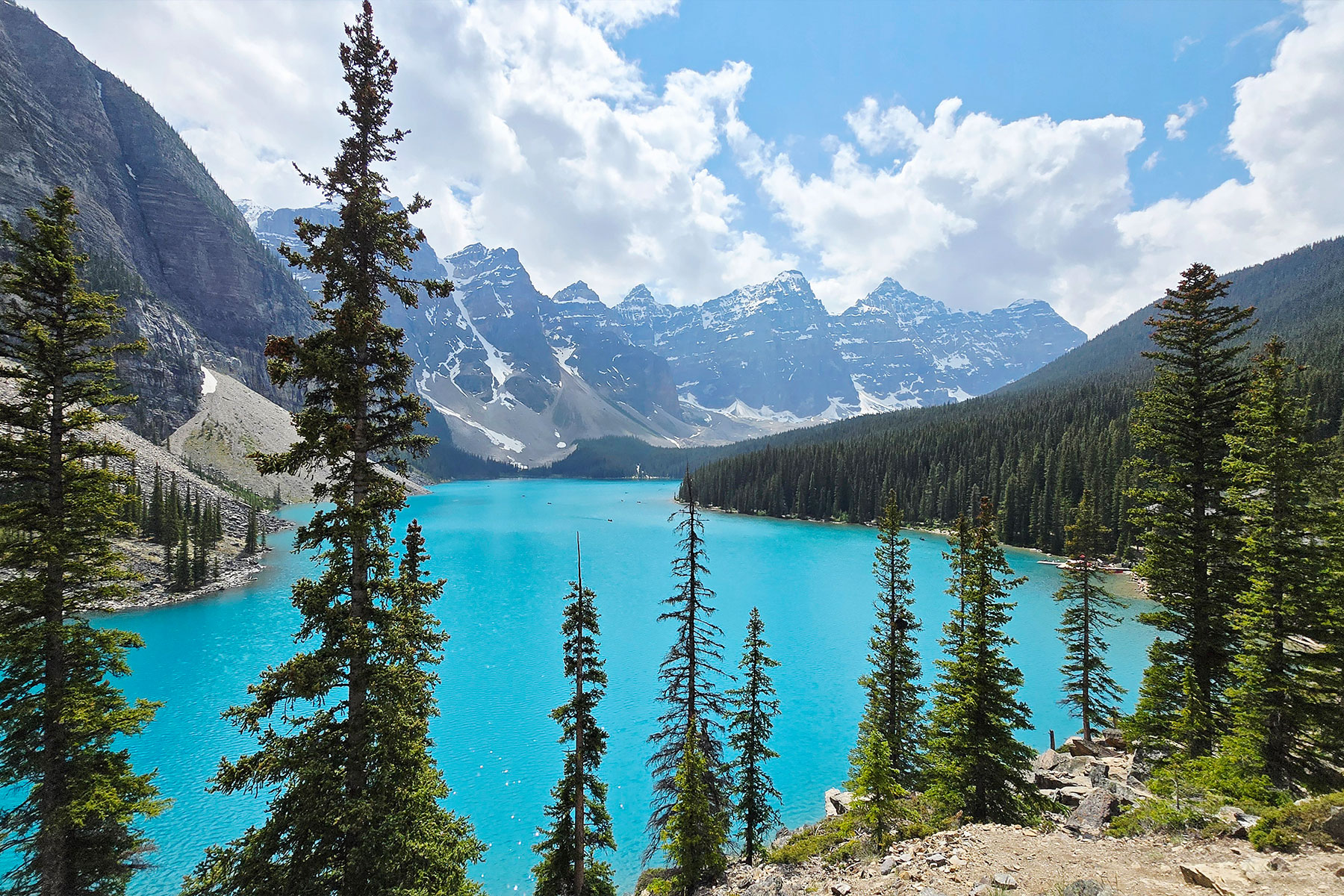Es ist wirklich notwendig, sich für die Seen Lake Louise und Moraine Lake das Shuttle vorab zu buchen. Man lernt mit seinen Vorhaben. In letzter Minute haben wir dennoch Glück und erwischen noch zwei Plätze für den Mittag. Nicht optimal, aber immerhin kommen wir hin. Und es lohnt sich. Spontan entscheiden wir uns, den Moraine Lake zuerst anzusteuern. Wieder erleben wir diese herrliche, unglaubliche Farbe des Wassers. Es ist ein perfekt gemaltes Bild. Der See ist gesäumt von einer Reihe schneebedeckter Berge und eingerahmt durch die dunklen Bäume. Auch wenn wir nicht den Sonnenaufgang mitbekommen und auch viele Besucher gleichzeitig hier sind, ist die Aussicht spektakulär. Am liebsten würde ich mir dieses Türkis in ein Glas abfüllen, zusammen mit der Bergkulisse.