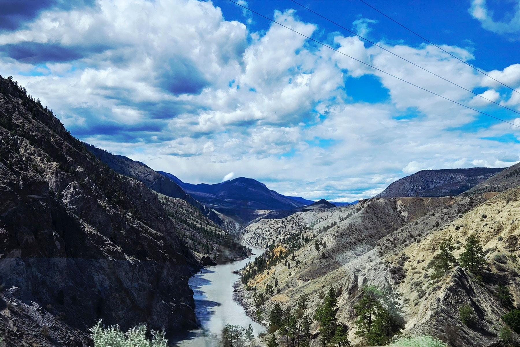 Schweren Herzens müssen wir die Veranstaltung dann aber verlassen. Schließlich haben wir noch ein paar Stunden Fahrt vor uns. Die Landschaft um Kamloops herum ist so anders als in den Rockies. Hügelige Prärielandschaft, meist mit kurzem Gras bewachsen, nur mit wenig Baumbestand. Irgendwie mag ich sie gern anschauen. Wir kommen an einigen Seen vorbei, deren Szenerie an die schottischen Highlands erinnert. Dann wird die Umgebung rauer. Die Grashügel werden von Felsen und trockenen Plateaus abgelöst, immer seltener kommen wir an Häuser oder Farmen vorbei. Die Canyon werden tiefer, die Wildnis unwegsamer, beinahe wüstenartig. Irgendwo wollen wir kurz Pause machen, aber hier scheint sich nichts anzubieten. Als wir nicht damit rechnen, stoßen wir auf den Railroad Tunnel Viewpoint im Fountain Valley vor Lillooet. Ein weiterer Wow Moment. Ein Fluss schlängelt sich tief im Canyon an uns vorbei, wild, hellgrau seine Farbe, umgeben von rotem und braunen Sandgestein inmitten dieser wüstenähnlichen Umgebung. Der Viewpoint befindet sich an einer Flussbiegung, so dass man zu beiden Seiten eine weite Sicht hat. Wir schnappen uns unsere Sandwiches und Wasserflaschen und setzen uns auf einem kleinen Felsen. Wir haben den Platz für uns ganz allein in dem Moment, nicht einmal ein anderes Auto kommt vorbei. Die Nachmittagssonne ist kräftig, kaum ein Lüftchen bewegt sich. Was für ein Klischee und so passend.