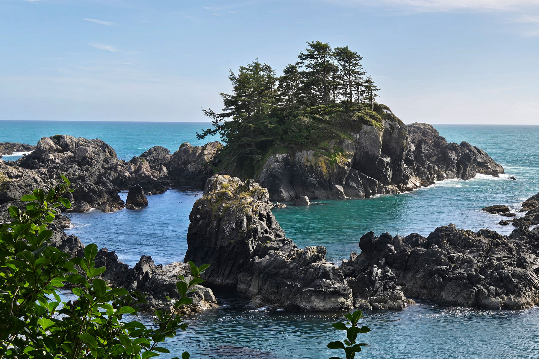 Wir verlassen den Norden von Vancouver Island und erreichen die südliche Küstenstadt Ucuelet – von den Einheimischen gerne Uci genannt. Das Wetter meint es weiter gut mit uns und wir machen noch am frühen Abend die kurze Wanderung am Lighthouse Loop. Wir blicken das erste Mal auf den freien Pazifik. Die Wege sind sauber angelegt es ist ein angenehmer Spaziergang in der Abendsonne. Zum Ende sehen wir schon den Einstieg in die am nächsten Tag geplante Tour auf dem West Pazific Trail. Der Wanderweg führt etwa 8 km an der Südküste vorbei bis zu den Rocky Bluffs. An vielen Stellen gibt es Bänke, um die Gelegenheit nutzen zu können, die Aussicht zu genießen. Wir bewundern die raue Küstenlandschaft mit den zerklüfteten Felsen und kleinen Sandstränden, auf denen sich Adler, Möwen und Seehunde tummeln. Wale sehen wir nicht zufällig, aber die Landschaft alleine reicht einmal mehr. Durch die Küstenwinde geformte Zypressen säumen unseren Weg. Führt der Weg ins Landinnere, so ist der subtropische Regenwald allgegenwärtig, moosbehangene Bäume, hohe Farne und andere dauergrünen Pflanzen. An den Rocky Bluffs gibt es eine Aussichtsbank, an der wir Pause machen und die Weite des Pazifiks auf uns wirken lassen. Auf dem Weg zurück nehmen wir noch den Giant Cedars Lehrpfad mit, ein kurzer, aber sehr informativer Loop auf halber Strecke.