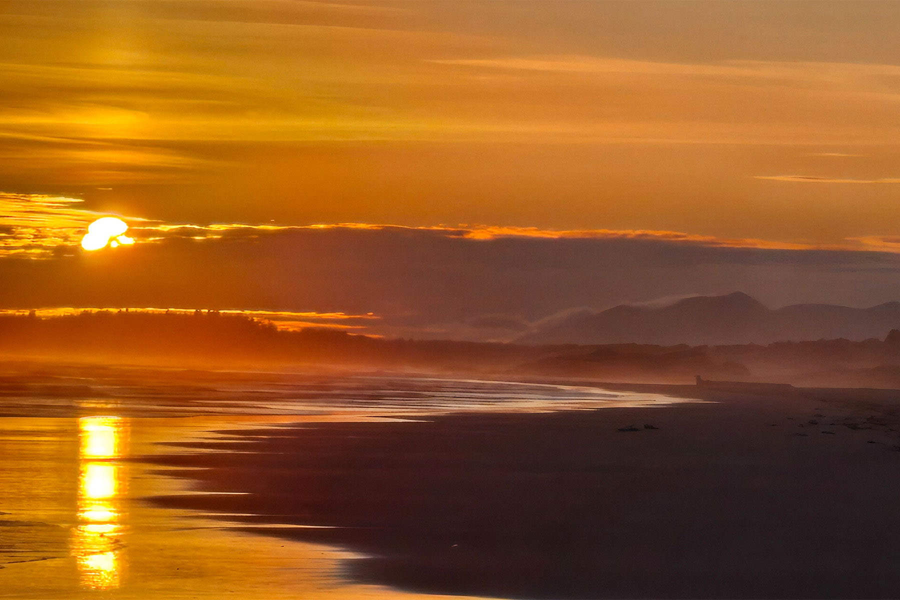 Den Nachmittag und dann auch spontan den Abend verbringen wir am Combers Beach, einem Teil des 16 km langen Longbeaches zwischen Ucuelet und Tofino. Es ist ein herrlich weitläufiger, natürlicher Sandstrand mit einer guten Brandung. Irgendwo suchen wir uns einen Platz auf den zahlreichen herumliegenden Baumstämmen und essen Hot Dogs. Nach einem langen Spaziergang merken wir, dass wir gute Chancen auf einen wunderschönen Sonnenuntergang hier haben. Dieser wird nicht nur wunderschön, sondern atemberaubend. Wir sind noch völlig allein hier, als leise Bodennebel sich bilden. Richtung Ucuelet wird die Luft über dem Wasser und am Strand diesig, wir können kaum noch den Pfad erkennen, den wir zurück zum Parkplatz nehmen müssen. Doch das interessiert uns im Augenblick überhaupt nicht. In Richtung Tofino hat der Maler die Aquarellfarben ausgepackt. Der Sand hat sich orangegefärbt, das Unterholz glimmt bis in die Baumkronen hinauf in den verschiedensten Lilatönen von dunkel nach hell. Dort holt der beginnende Sonnenuntergang die Farben von purpurrot bis orange und goldgelb ab. Es ist ein kunstvoll gemaltes Bild, die Farbverläufe so schön verlaufen, die Stimmung mystisch. Ich kann mich nicht sattsehen an diesem Bild. Wir haben gar nicht gemerkt, dass wir noch von einer Handvoll Leuten Gesellschaft bekommen haben, die ebenso gebannt auf das Schauspiel schauen. Irgendwann taucht die Sonne ins Meer, man meint, das Zischen zu hören und ein Streifen Licht zieht sich übers Wasser, ehe es dunkel wird.