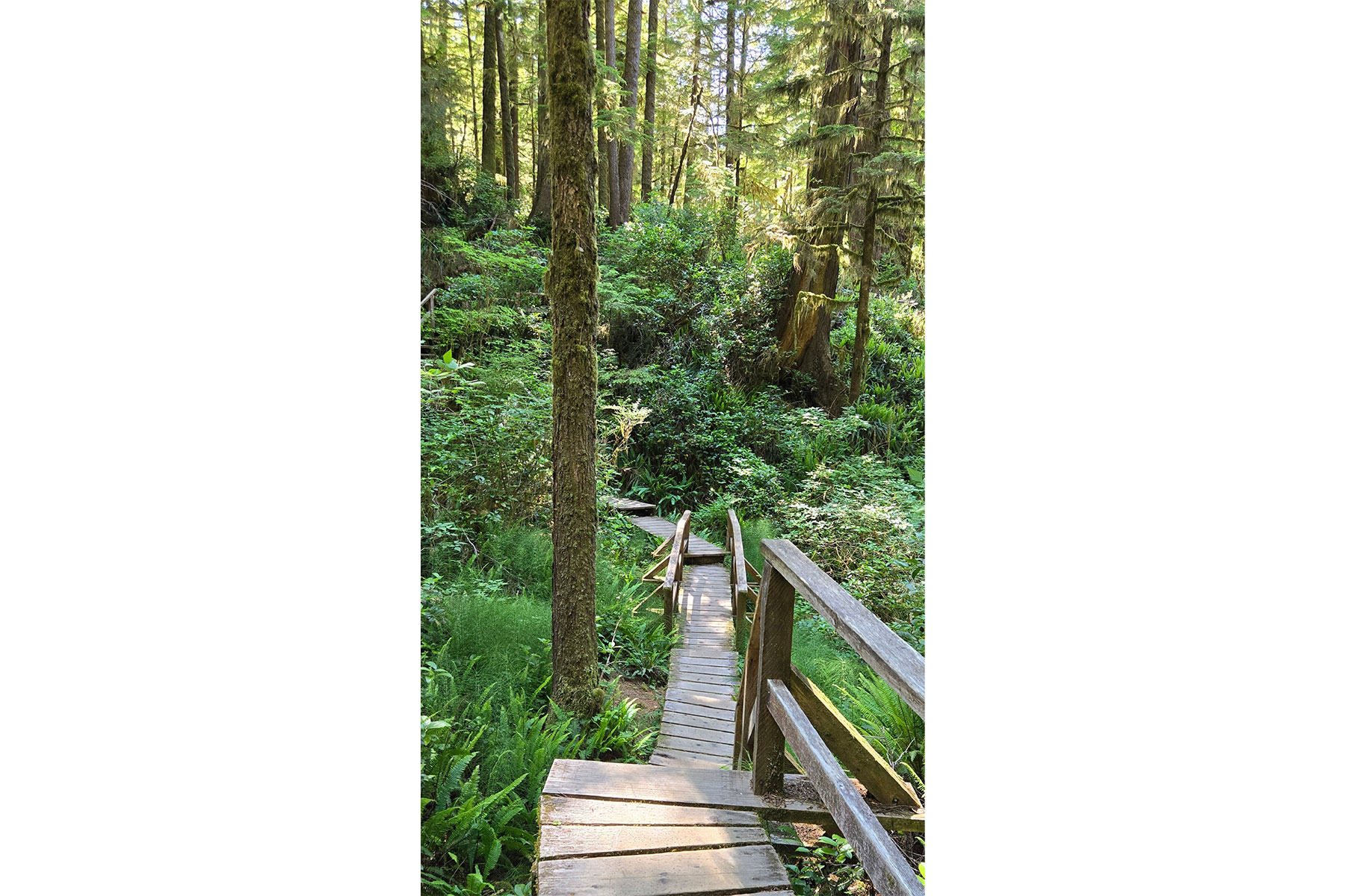 Auf dem Weg zurück nach Ucuelet halten wir noch am Rainforest Trail und verschaffen uns nach der Bootstour noch Bewegung. 700 Stufen hinunter in den Regenwald, zur Schonung des Unterholzes über extra gefertigte Holzstege und wieder hinauf. Unterwegs lernen wir linksseitig der Straße des alten, gewachsenden Regenwald kennen, es herrscht eine fast heilige Stille, nur durchdrungen vom Geschrei einiger Krähen. Verschlungene Wege runter zu den Wurzeln der mächtigen Giganten bis zu den lichten, moosbewachsenen Ästen hinauf. Auf der rechten Straßenseite geht es um den nachwachsenden, jungen Regenwald, der sich noch entwickelt. Vielleicht nur gefühlt, aber hier erscheint es nicht so ehrfürchtig wie drüben. Der kleine Ausflug hat sich auf jeden Fall gelohnt.