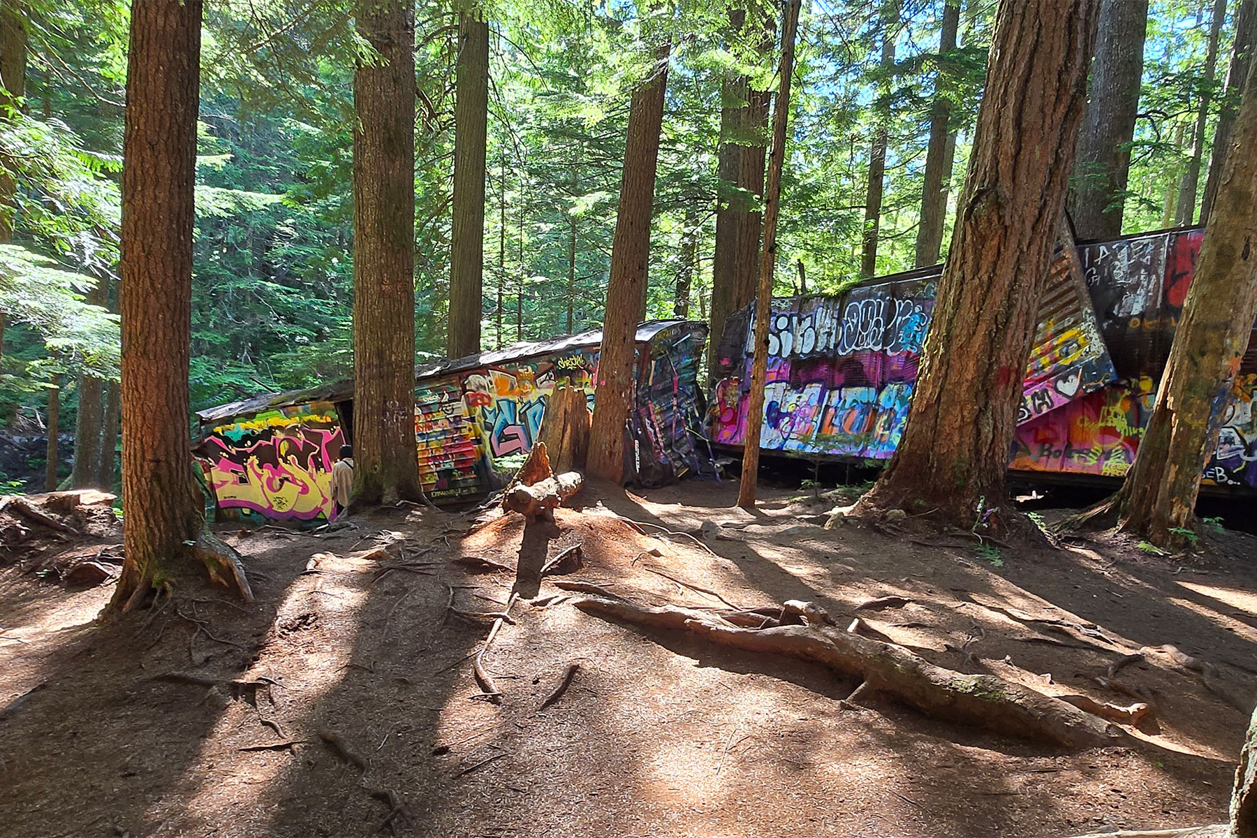 Am nächsten Morgen brechen wir auch schon wieder früh auf. Wir wollen noch einen Abstecher zu den Train Wracks machen. Eine etwa 20 minütige Wanderung bringt uns zu der Hängebrücke, die wir überqueren müssen, um zu den Eisenbahnwaggons zu gelangen. Mitten einem Waldstück mit Giant Cedars liegen sie dann plötzlich vor uns, verstreut wie Legobausteine im Kinderzimmer. Sie sind durch ein Kunstprojekt mit bunten Graffitis besprüht worden. Das ist wieder so ein Farbkontrast zur natürlichen Umgebung mitten im Wald. Wir erkunden einen Waggon nach dem Nächsten, klettern dabei über riesige Wurzeln und nicht wenige Felsen. Insgesamt sieben Waggons liegen hier nachdem sie nach einem Unfall in 1956 kurzerhand von den Gleisen entsorgt worden sind. Bei dem ein oder anderen Waggon hätte es mich nicht gewundert, wenn ein vierbeiniger Bewohner herausgesprungen wäre.