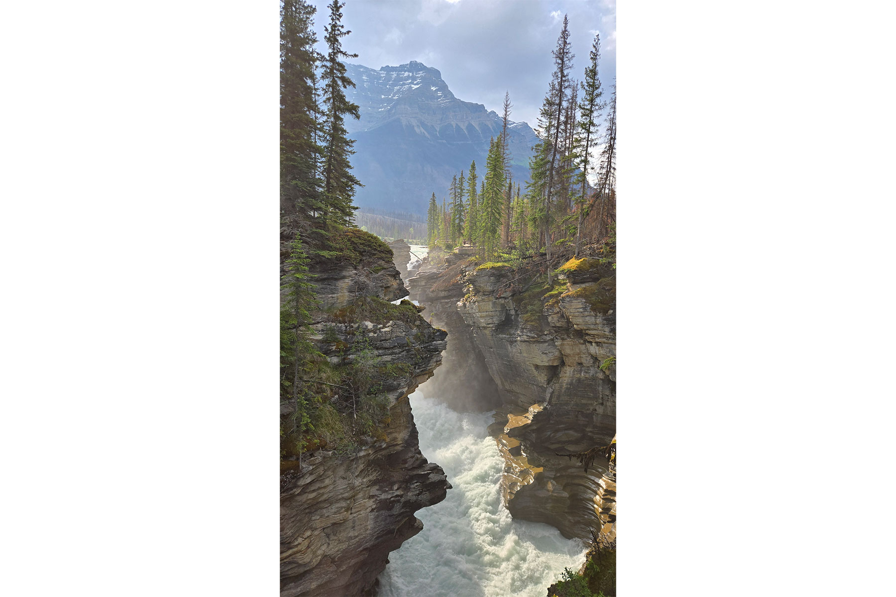 Wir sind schon ein paar Mal in Kanada gewesen, aber tatsächlich noch nie auf dieser Straße. Kaum zu glauben. Die Straße allein ist einen ganzen Urlaub wert! Wir starten früh am Morgen, um möglichst vor dem großen Besuchersturm auf der Strecke zu sein und es gelingt uns. Erster Halt, die Athabasca Falls. Die Sonne ist aufgegangen und verspricht einen weiteren strahlenden Sommertag. Schön, dass wir dem Fluss noch einmal begegnen, dem wir eine so tolle Zeit verdanken. Der Wasserfall ist beeindruckend, mit welcher Kraft das Wasser angerauscht kommt und tosend den Canyon hinunterstürzt. Die Massen haben den Fels kugelrund ausgehöhlt, das Wasser gurgelt und tanzt , während es sich seinen Weg flussabwärts sucht. Die Morgensonne scheint goldfarben in den Canyon hinein, Wassertropfen glitzern und es ist einfach eine Farbexplosion der Natur. Mein Herz hüpft, so kitschig das aus klingt, egal. Ich versuche mir jeden Eindruck, jedes Bild, jeden Geruch genau einzuprägen für später.