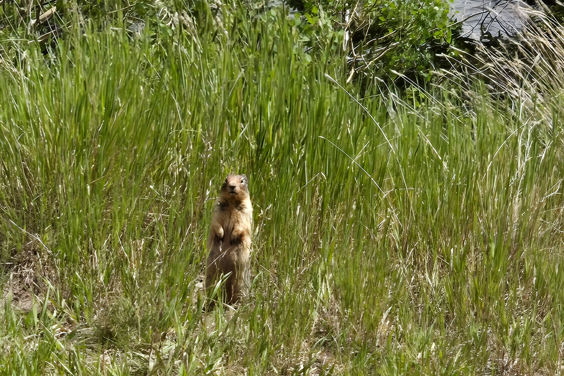 Wir nähern uns Banff. Vor der Stadt gibt es einen weiteren Aussichtspunkt, der auf die umliegenden Berge verweist, wie z.B. den Bourgeau 2930m, der Sulphur 2451m. Die Rampe des Berges ist recht markant. Mein Blick fällt auf etwas vor uns, im Gras. Vermutlich hat man für Touristen einen Präriehund ins Gras gestellt, um die örtliche Fauna darzustellen. Keck und starr ist der Blick auf die Leute gerichtet – bis der kleine Kerl plötzlich blinzelt und die Nase rümpft. Der ist ja echt! Ich lache laut auf, doch das scheint ihn nicht zu beeindrucken. Wieder unbewegt steht er da auf seinen Hinterbeinen und läßt sich nichts entgehen. Zu meiner Verteidigung sei gesagt, dass ich nicht die Einzige bin, die auf ihn reingefallen ist.