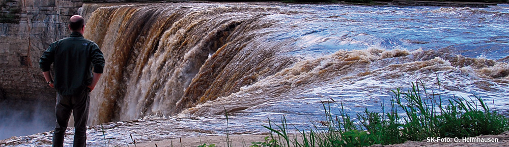 "Such dir den besten Platz aus", ruft er durchs Autofenster, "und schieb das Geld morgen unter der Bürotür durch!" Am Ende sehe ich auf dem Weg zum Büffel-Nationalpark mehr dieser Fleischberge als im Park selbst. Bullen, Kühe, Junge. Safari-Momente wie in Afrika. Auch auf dem Weg zurück nach Westen bin ich mutterseelenallein. Manchmal halte ich an, falte meinen Klappstuhl auseinander und nehme eine Weile mitten auf der Piste Platz, um in die Stille zu lauschen. In Deutschland undenkbar. Nicht die schlechteste Art, ein Gefühl für das Land zu bekommen. Genau das bezweckt auch Doug Lamalice mit seiner Tour "Walk a mile in my Mocassins". Der massige Dene First Nations lebt südlich von Hay River und nimmt seine Gäste mit auf eine zweieinhalb Kilometer lange Reise durch seine Kultur. Dabei dienen die spektakulären Alexandra-und-Louise-Wasserfälle im Twin Falls Gorge Territorial Park als Kulisse. "Meine Gäste sollen Mutter Natur spüren und lernen, mit ihr anstatt gegen sie zu arbeiten." Nach einem Gebet marschieren wir los. Doug erzählt von Traditionen und Zeremonien, wie seine Vorfahren die Kanus um die unfahrbaren Wasserfälle zogen und die Jungen in feierlichen Zeremonien zu Männern wurden. Das ist zwar lange her, doch das Land ist dasselbe. Es macht die Menschen, wie man hier sagt. Auch an mir arbeitet es. Jeden Tag fällt ein wenig mehr Stress von mir ab. Der Spagat zwischen Vergangenheit und Gegenwart sei nicht einfach, sagt Doug, es gebe aber auch eindeutige Vorteile. "Früher brauchten wir 14 Tage, um den Great Slave Lake zu erreichen. Heute sind wir in 45 Minuten da. Wenn die Straße okay ist!