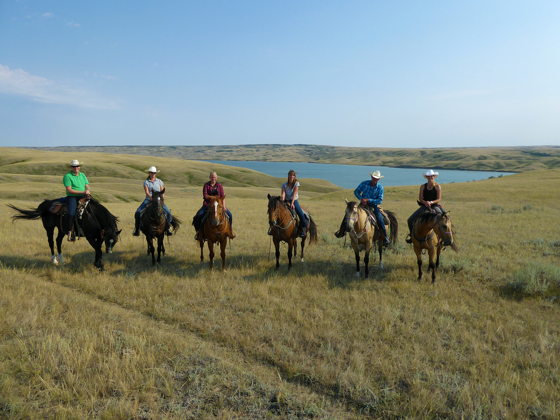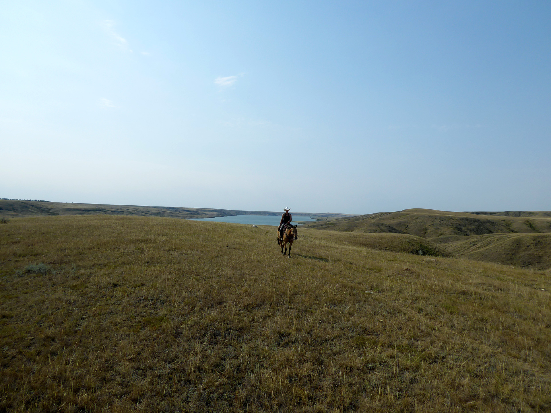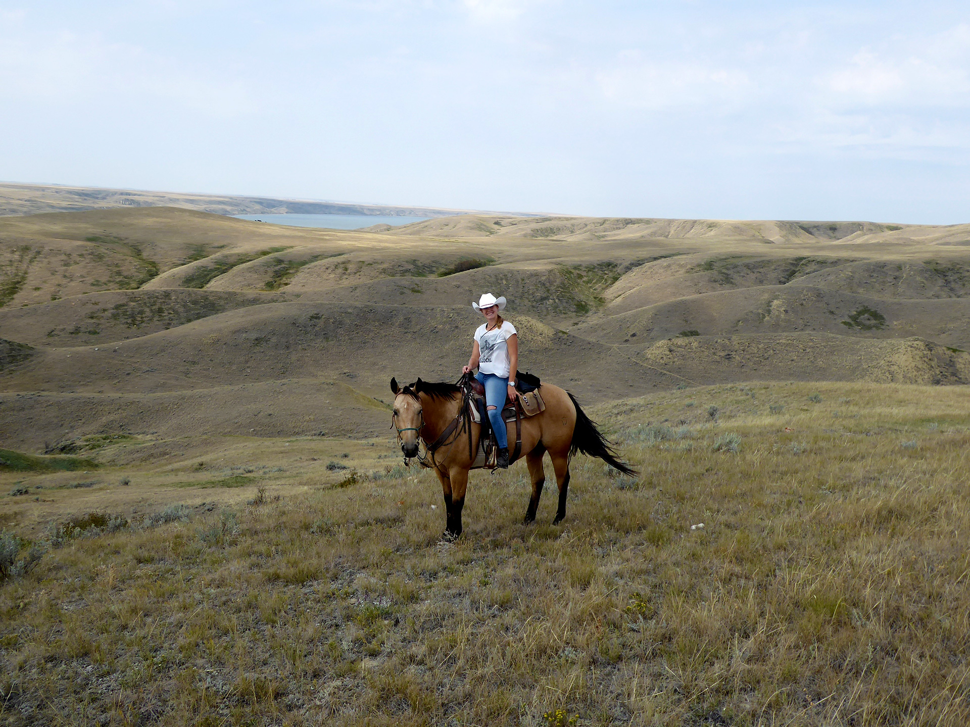 Gut gestärkt begleite ich George gemeinsam mit den reitbegeisterten Gästen zu seinen Pferden. Jetzt heißt es putzen, satteln und trensen, bevor es auf Entdeckungstour geht. George sucht jedem Gast ein passendes Pferd aus. Er kennt seine Vierbeiner in- und auswendig und liegt mit seiner Zuordnung meist goldrichtig. Wenn Pferd und Reiter doch mal nicht zusammenpassen, hat George immer eine Alternative parat. Für mich geht es heute in den Sattel des Falben Levi. Das Wetter ist klar auf unserer Seite und spendiert uns optimale Reitbedingungen. Der wolkenlose Himmel sorgt in Kombination mit strahlendem Sonnenschein bei allen Beteiligten für hervorragende Stimmung. Das Reiten durch Saskatchewans Ranchland ist eine ganz neue Erfahrung für mich. Mit Gras überzogene Hügel erstrecken sich über einen Großteil der Umgebung. Mitten hindurch zieht sich der etwa 200 Kilometer lange Lake Diefenbaker. Platz ohne Ende! George fordert uns dazu auf, unseren eigenen Trail zu suchen und die Gruppenformation zu verlassen. Obwohl George die grobe Richtung vorgibt, ist jeder ganz individuell unterwegs. Nur ich, das Pferd und die endlos weite Prärie.