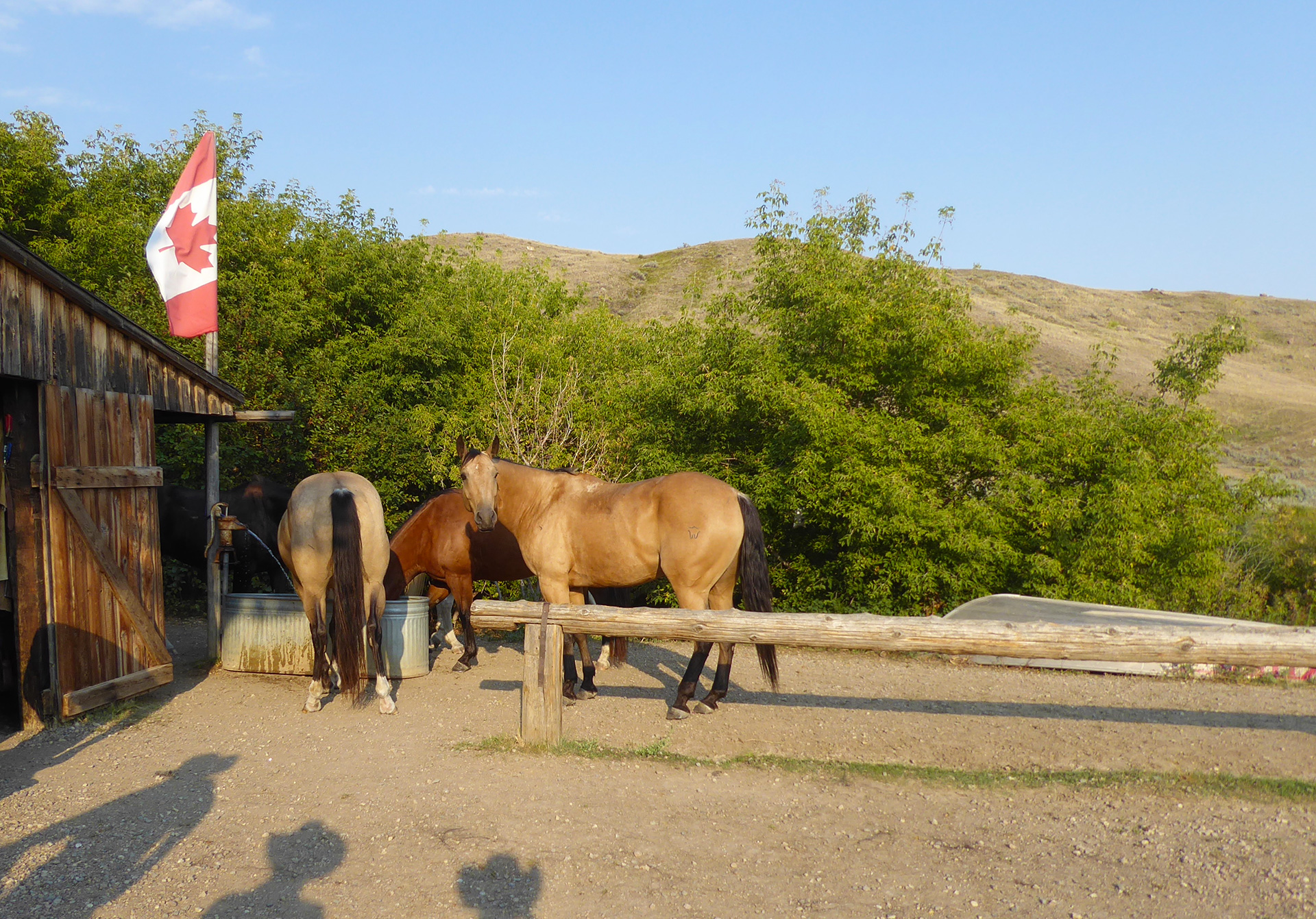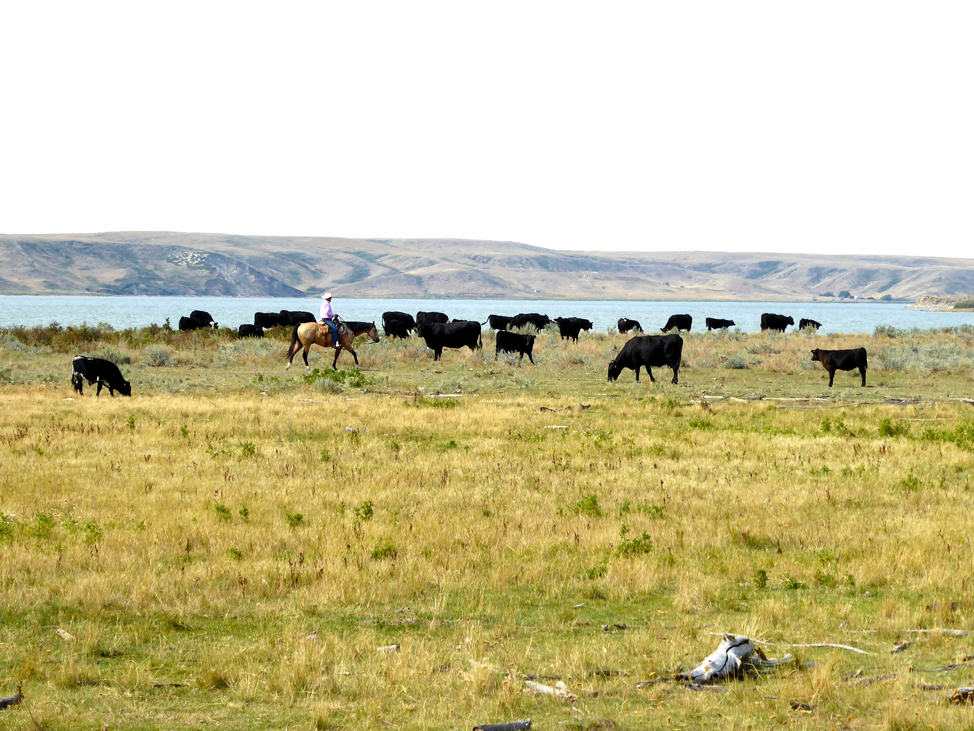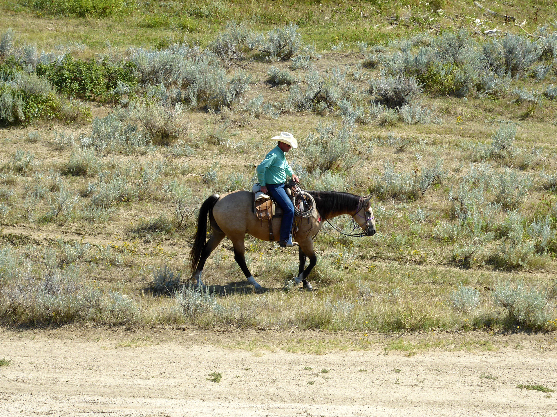 Gut gestärkt begleite ich George gemeinsam mit den reitbegeisterten Gästen zu seinen Pferden. Jetzt heißt es putzen, satteln und trensen, bevor es auf Entdeckungstour geht. George sucht jedem Gast ein passendes Pferd aus. Er kennt seine Vierbeiner in- und auswendig und liegt mit seiner Zuordnung meist goldrichtig. Wenn Pferd und Reiter doch mal nicht zusammenpassen, hat George immer eine Alternative parat. Für mich geht es heute in den Sattel des Falben Levi. Das Wetter ist klar auf unserer Seite und spendiert uns optimale Reitbedingungen. Der wolkenlose Himmel sorgt in Kombination mit strahlendem Sonnenschein bei allen Beteiligten für hervorragende Stimmung. Das Reiten durch Saskatchewans Ranchland ist eine ganz neue Erfahrung für mich. Mit Gras überzogene Hügel erstrecken sich über einen Großteil der Umgebung. Mitten hindurch zieht sich der etwa 200 Kilometer lange Lake Diefenbaker. Platz ohne Ende! George fordert uns dazu auf, unseren eigenen Trail zu suchen und die Gruppenformation zu verlassen. Obwohl George die grobe Richtung vorgibt, ist jeder ganz individuell unterwegs. Nur ich, das Pferd und die endlos weite Prärie.
