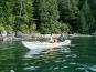 Wir haben einige Zeit dort verbracht, die Stille und Ruhe genossen, uns die Seesterne und Minikrebse im Wasser angeschaut und nach „der“ Robbe Ausschau gehalten, die 2005 während unserer Trauung zugeschaut hatte. Irgendwann mussten wir uns aber losreißen und weiterfahren, denn wir waren mit Trish, der Tochter von Marcia und Dennis, und ihrer Familie verabredet, die mit weiteren befreundeten Familien am Cowichan Lake ein verlängertes Wochenende verbrachten. Wir hatten aufgrund des tollen Panoramas die Strecke über den West Coast Scenic Drive gewählt, denn in Kanada gilt im wahrsten Sinne des Wortes: der Weg ist das Ziel, überall phänomenale Aussichten! Was auf der Karte aber wie ein Katzensprung aussieht, dauerte gute 5 Stunden, sodass wir erst gegen 17.30 Uhr am See ankamen, wo wir auf der sehr holprigen North Shore Road bis zum Campground noch einmal ca. 40 Minuten entlangrumpelten. Trish und Drew begrüßten uns herzlich, sie hatten sich schon gefragt, wo wir wohl bleiben. Aber da Trish einmal kurze Zeit mit meinem Mann liiert war (sie kennen sich aus Australien, er hatte sie vor einigen Jahren in Kanada besucht), wusste sie wohl, dass man sich keine ernsthaften Sorgen machen muss, wenn er unpünktlich ist. Das ist in seiner Welt völlig normal.