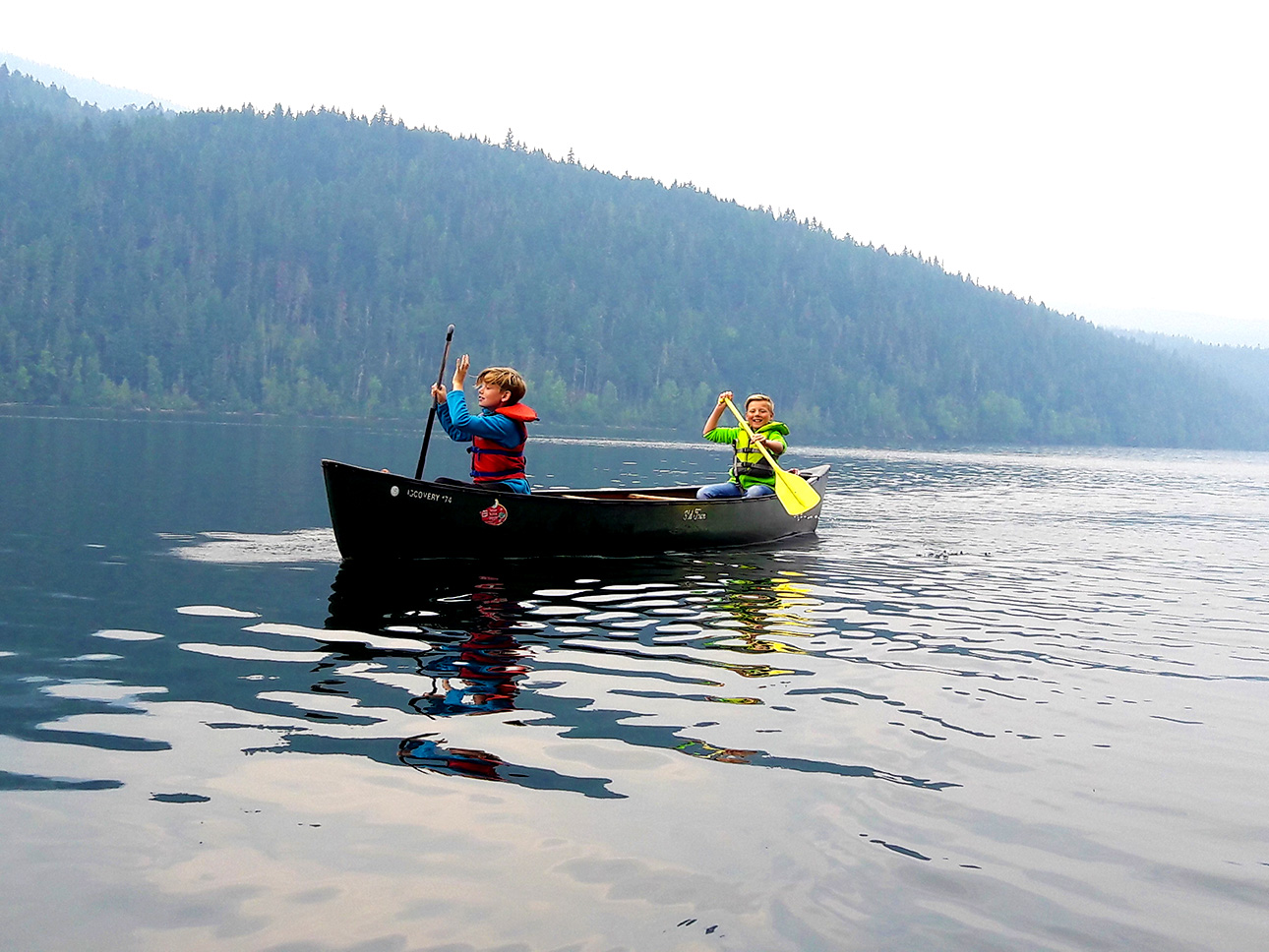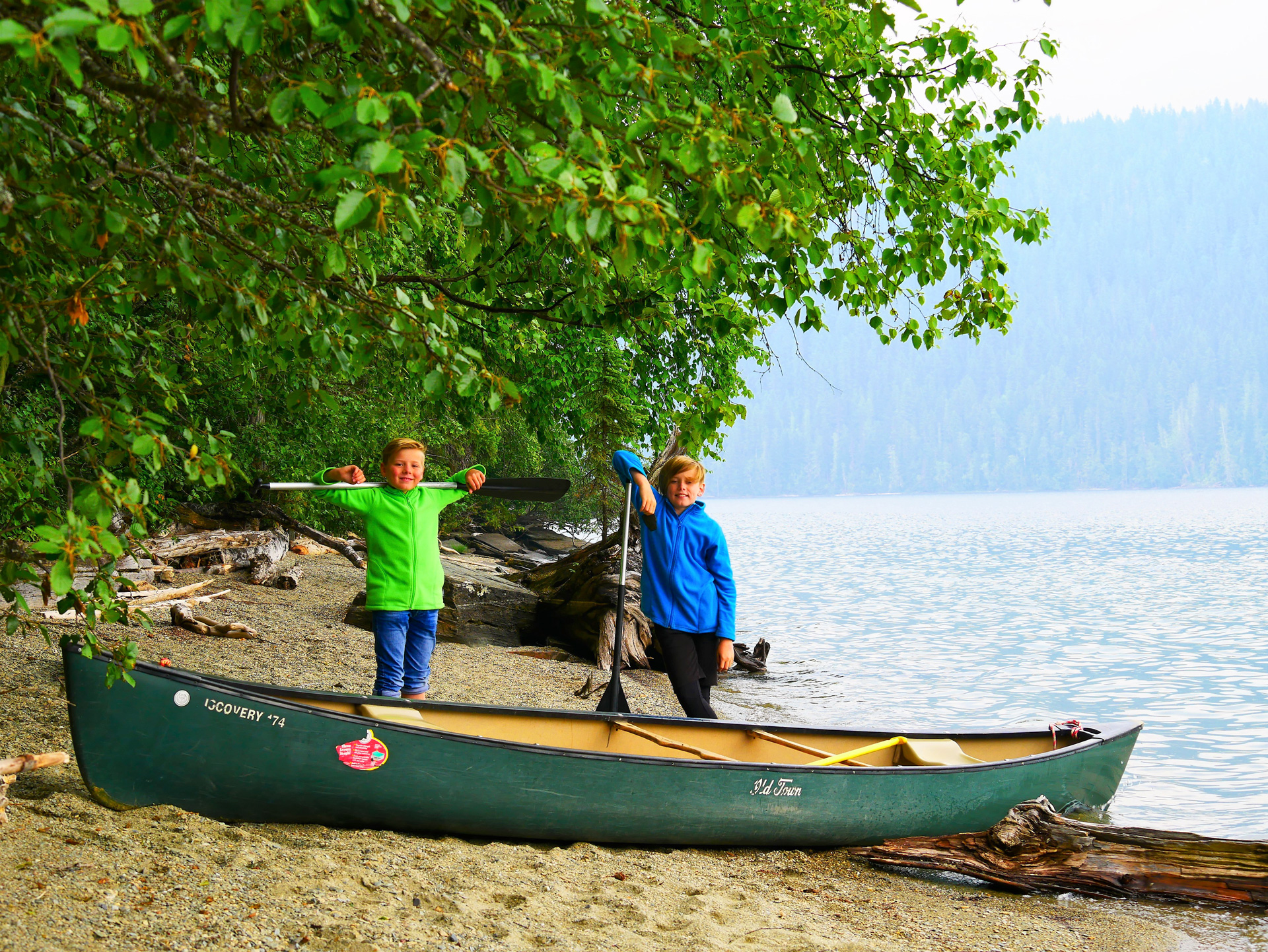Am nächsten Morgen holten wir uns die Westen und Paddel am Osprey Café ab und fuhren dann weiter bis zum Bootssteg, wo die Kanus lagen. Dort trugen wir zwei Kanus ins Wasser und paddelten los. Ich mach es kurz: Wir waren mehrere Stunden auf dem See, legten eine gute Strecke zurück, machten an einem netten Strand Halt und fuhren dann wieder zurück, aber: Nach unseren Kajaktouren auf dem Meer zwischen Orcas, Seelöwen und Schweinswalen war das hier doch eher mau. Die Enten konnten uns nicht beeindrucken, der Himmel war immerwährend leicht von Rauch überzogen und das Kanufahren war im Gegensatz zum Kayaking so anstrengend, dass unsere Kinder irgendwann streikten, sodass wir auf dem Rückweg umdisponierten, mitten auf dem See die Plätze in den Kanus tauschten und Yannick und Noah in einem Boot mit einem Seil hinter uns herzogen. Fazit: Es war nett, aber der Wells Gray Park ist wirklich nichts für uns. Das war seine letzte Chance!