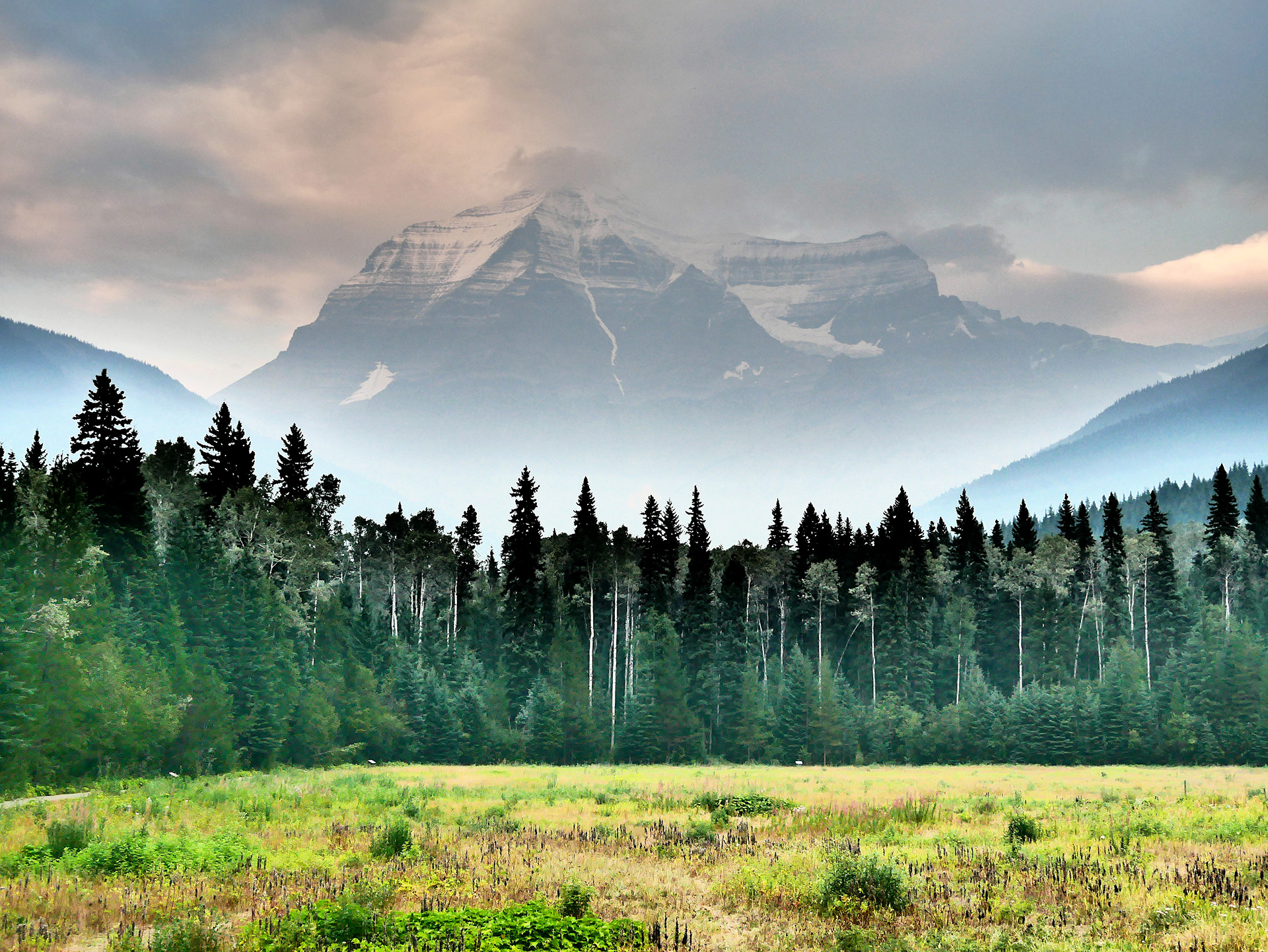 Wir nahmen den Highway 5 nach Norden und bogen dann nach Osten Richtung Rockies ab zum Mount Robson Campground, wo wir aufgrund unserer relativ frühen Ankunft und wegen der Größe des Platzes noch eine sehr schöne Campsite bekamen. Nachdem wir uns kurz eingerichtet hatten, machten wir einen herrlichen Rundgang zum Fluss und zurück und spazierten dann zum Mount Robson Information Centre mit tollem Panoramablick auf den Berg, der sich diesmal zwar nicht vor blauem Himmel, aber immerhin fast komplett zeigte (wir sind schon mehrfach an ihm vorbeigefahren, haben ihn aber nie richtig zu Gesicht bekommen).