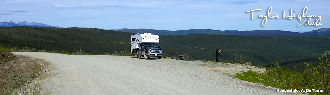 Am nächsten Morgen also los auf den Top of the World Highway. Bei bestem Wetter wieder ziemlich viele Fotostopps und um 15 Uhr waren wir erst an der Border Yukon/Alaska. Der Officer war ziemlich mürrisch und inspizierte unseren Camper sehr genau. Egal, wir hatten nichts zu verbergen, gingen ins Häuschen, zahlten p.P. 6$ (nur cash) und bekamen unseren Einreisezettel in den Pass geheftet. Nun wird aus dem Top of the World Highway der Taylor Highway.
