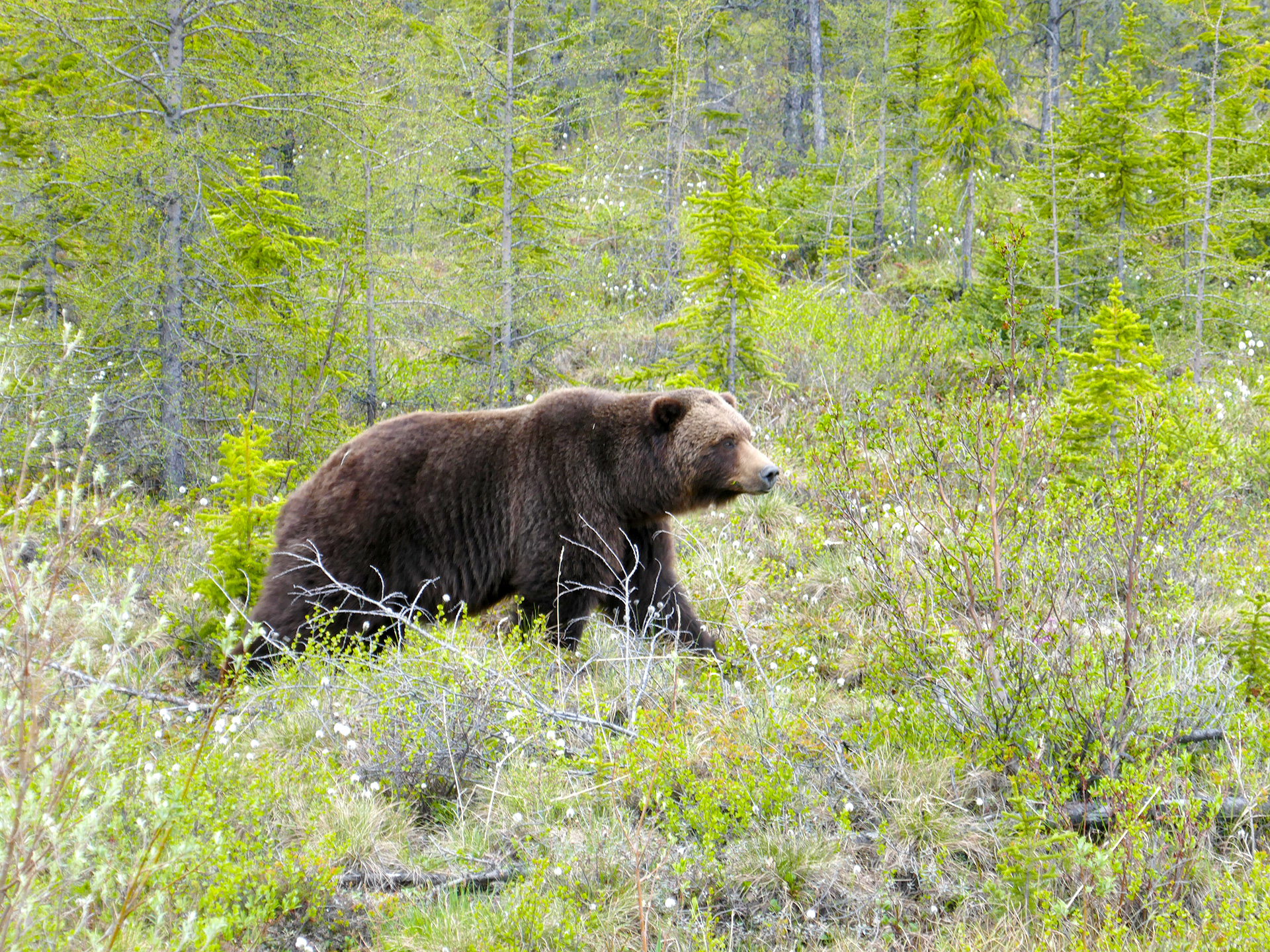 In der Nacht fing es leicht an zu regnen und der nächste Morgen war ziemlich frisch. Erst mal die Heizung an und auftauen. An dem Ogilvie Ridge Viewpoint hatten wir um 11 Uhr gerade mal 3 Grad. Auf dem Weg nach Eagle Plains zog Nebel auf und in einiger Entfernung machte ich einen dunklen Fleck aus. Halt! Da lief ein richtig großer Grizzly direkt am Straßenrand und ließ sich durch uns nicht stören. Er fraß saftiges Grün und wir konnten ihn lange Zeit beobachten. Ein paar Kilometer weiter ließ sich auch noch ein Schwarzbär, ein Marder sowie ein Fuchs sehen. Das Wetter blieb grau und wolkenverhangen. Gegen 14 Uhr kamen wir in Eagle Plains an. Da dies die einzige Versorgungsstation auf dem Dempster Highway ist (die nächste ist in Inuvik), tankten wir noch mal den Camper voll und beschlossen, dort auf dem CG zu übernachten. 20$ inkl. Duschen, wobei die Duschen schon sehr speziell sind, aber sie haben ihren Zweck erfüllt.