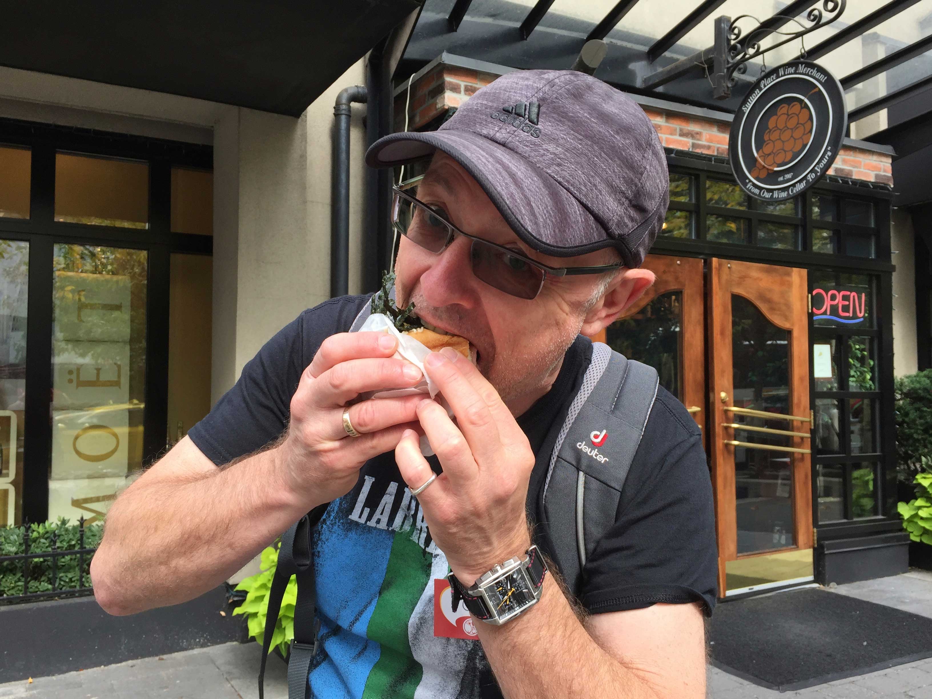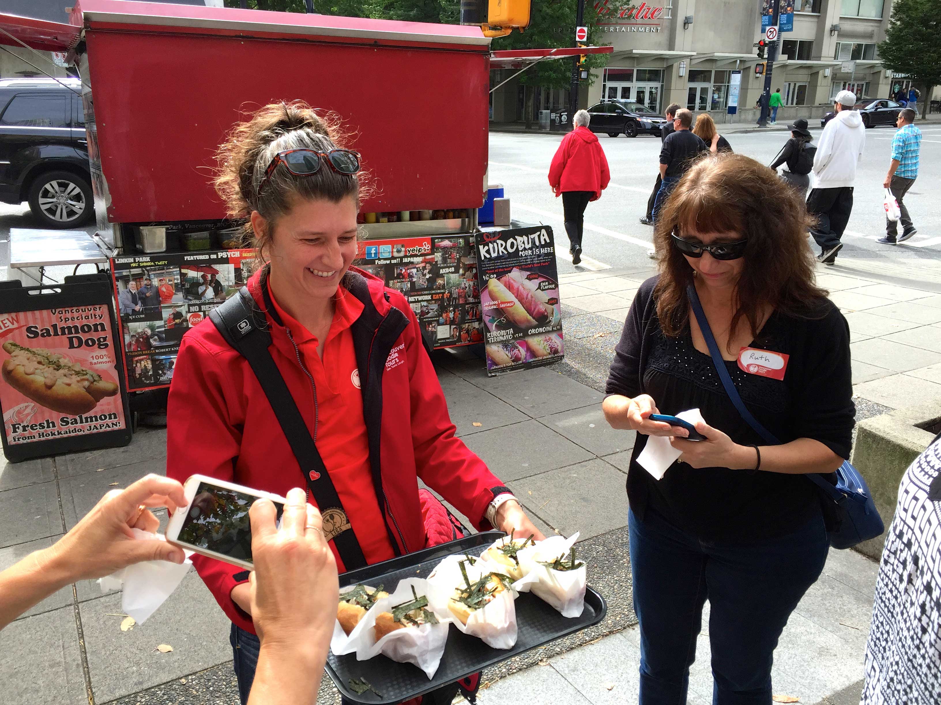 Unser vitaler Guide heißt Jennifer und ich treffe sie und die übrigen Teilnehmer dieser Tour, ein Ehepaar und zwei Freundinnen - alle Kanadier - wie verabredet um 10 Uhr morgens an der Ecke Burrard und Smithe. Die Wahl des Ortes ist kein Zufall. Hier steht einer der ältesten Foodtrucks der Stadt. Er brachte 2005 die Foodtruckbewegung quasi ins Rollen, und zwar mit einer Kreation, die mir, als ich damals in Montréal davon las, den Magen umdrehte: ein Hot-Dog-Brötchen mit einer fettigen Wurst aus Kurobuta-Berkshire-Schwein - dem Vernehmen nach der Rolls Royce in der Schweinefleischwelt - mit Teriyakisauce, japanischer Mayo, schleimigen gebratenen Zwiebeln und in Streifen geschnittenem Seetang darüber. "Japadog" heißt die Kreation. Und Jennifer lässt uns probieren. Bin ich skeptisch? Klar! Schließlich bin ich aus Ostwestfalen, wo man nach der Devise "erst mal gucken" lebt. Ich beiße also hinein - und erlebe mein blaues Wunder! Es schmeckt super lecker! Kein Wunder,