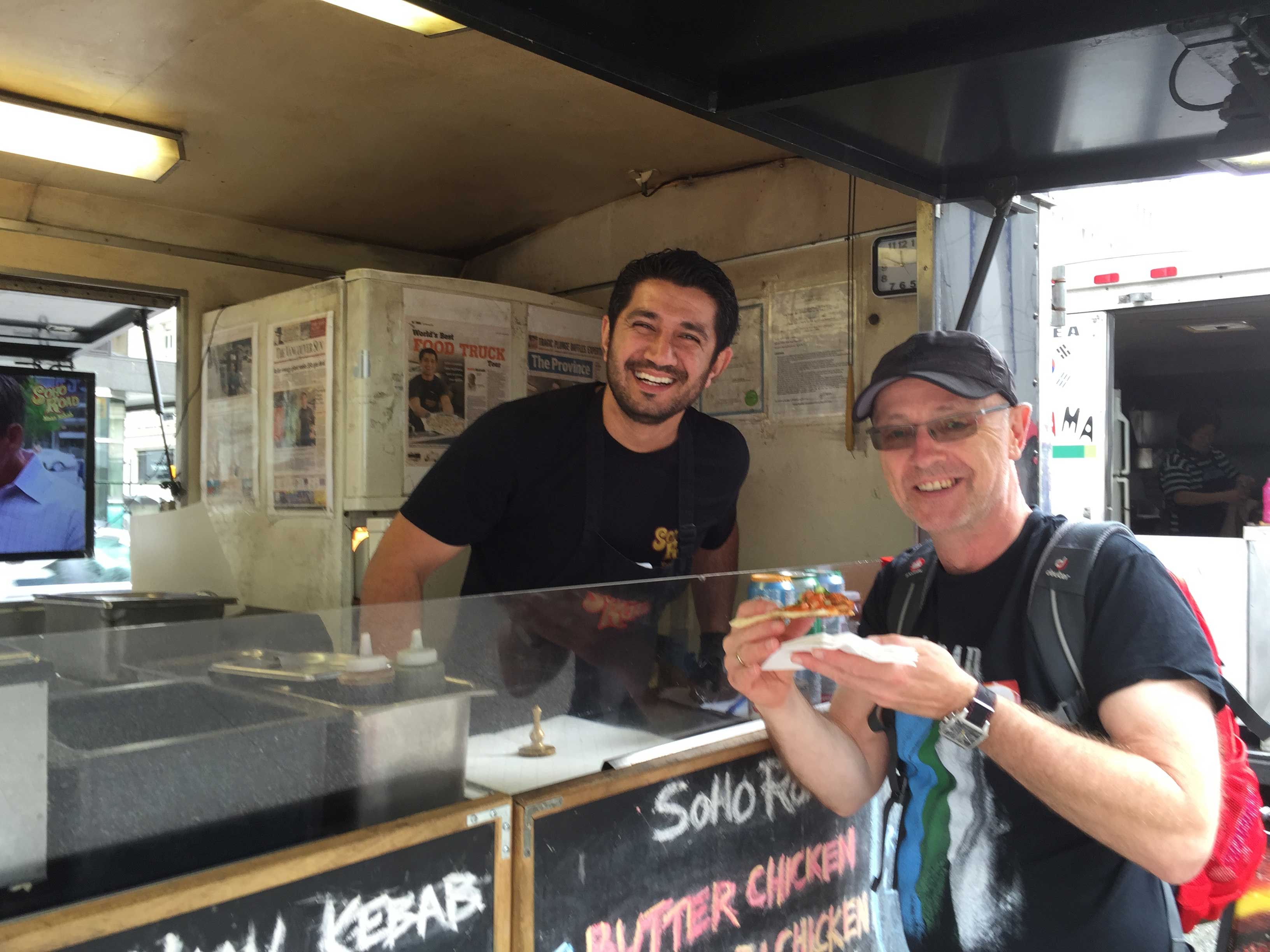 An der entsprechend pulsierenden Ecke Granville und Georgia heißt es dann wieder Essenfassen, dieses Mal indisch. "Soho Road" heißt der Truck - zur Erinnerung des Besitzers an seine Zeit im britischen Birmingham. Als ich über den Counter spähe, läuft mir das Wasser im Mund zusammen. Da sind gleich zwei irdene Tandoori-Öfen in Betrieb! Der Duft ist betörend und zieht auch den Leuten an der nahen Bushaltestelle in die Nase. Jennifer bestellt eine ausladende Platte mit Butter Chicken und Tandoori Chicken Wraps. Sagte ich schon unwiderstehlich? Und ja, essen entspannt. Die Atmosphäre lockert sich zusehends unter uns Teilnehmern. Gefällt mir!